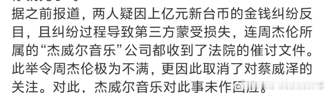 周杰伦曾多次提携蔡威泽周杰伦或被欠上亿新台币周杰伦警告蔡威泽再不出现就完了不纵容