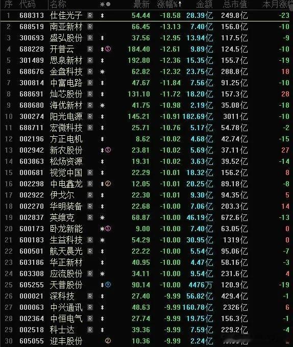 今天跌幅榜清一色高标人气股,开普云大跌12CM,思泉新材大跌12CM,金盘科技大跌12CM,灿芯股份大跌11CM,阳光电源大跌10CM,方正电机跌停,视觉中国跌停,英维克技跌停,深科技跌停,中兴通讯跌停,中马传动跌停。