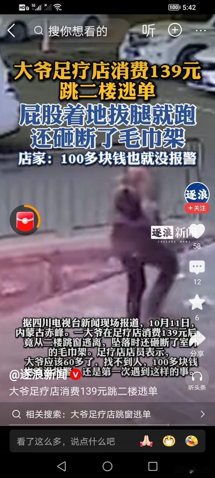 一早晨我被这个大爷笑麻了!震撼了!说咱们赤峰某足浴店,一个大爷消费139元后,为了逃单,从二楼跳下跑了,看视频大爷身形矫健,步行如飞,一看平时就没少保健脚丫子。 古有亡羊补牢,今天店家肯定得“亡单补窗”了,其实,真的不是笑谈,如果大爷从二楼跳下出了意外,店家的肯定会有责任的,这年头,干啥都不容易,开店,做买卖的,都引以为戒吧[捂脸][祈祷][祈祷][祈祷]