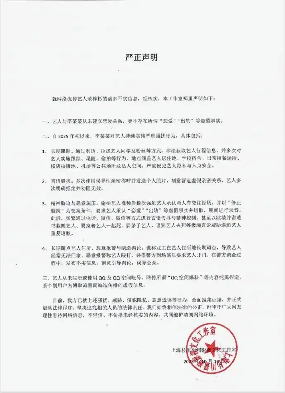 10月15日,女演员李禹熹曾发文喊话19岁男演员荣梓杉,曝荣梓杉恋爱期间出轨打人,她因其一度确诊中度焦虑和抑郁。10月16日,荣梓杉工作室发布相关声明回应,并称已启动法律程序,附带报案回执。