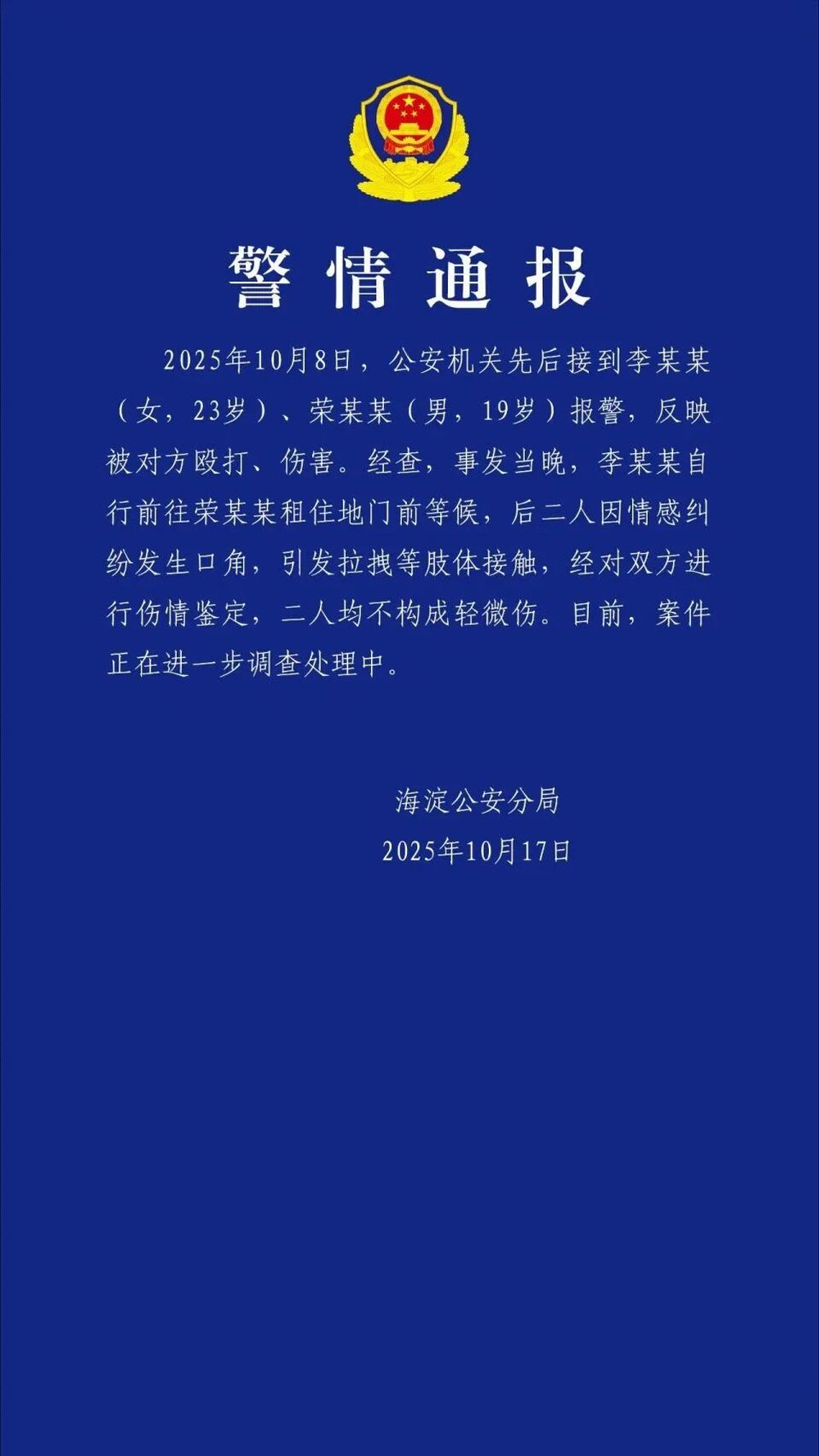 北京海淀公安分局通报,10月8日,公安机关先后接到李某某(女,23岁)、荣某某(男,19岁)报警,反映被对方殴打、伤害。经查,事发当晚,李某某自行前往荣某某租住地门前等候,后二人因情感纠纷发生口角,引发拉拽等肢体接触,经对双方进行伤情鉴定,二人均不构成轻微伤。目前,案件正在进一步调查处理中。