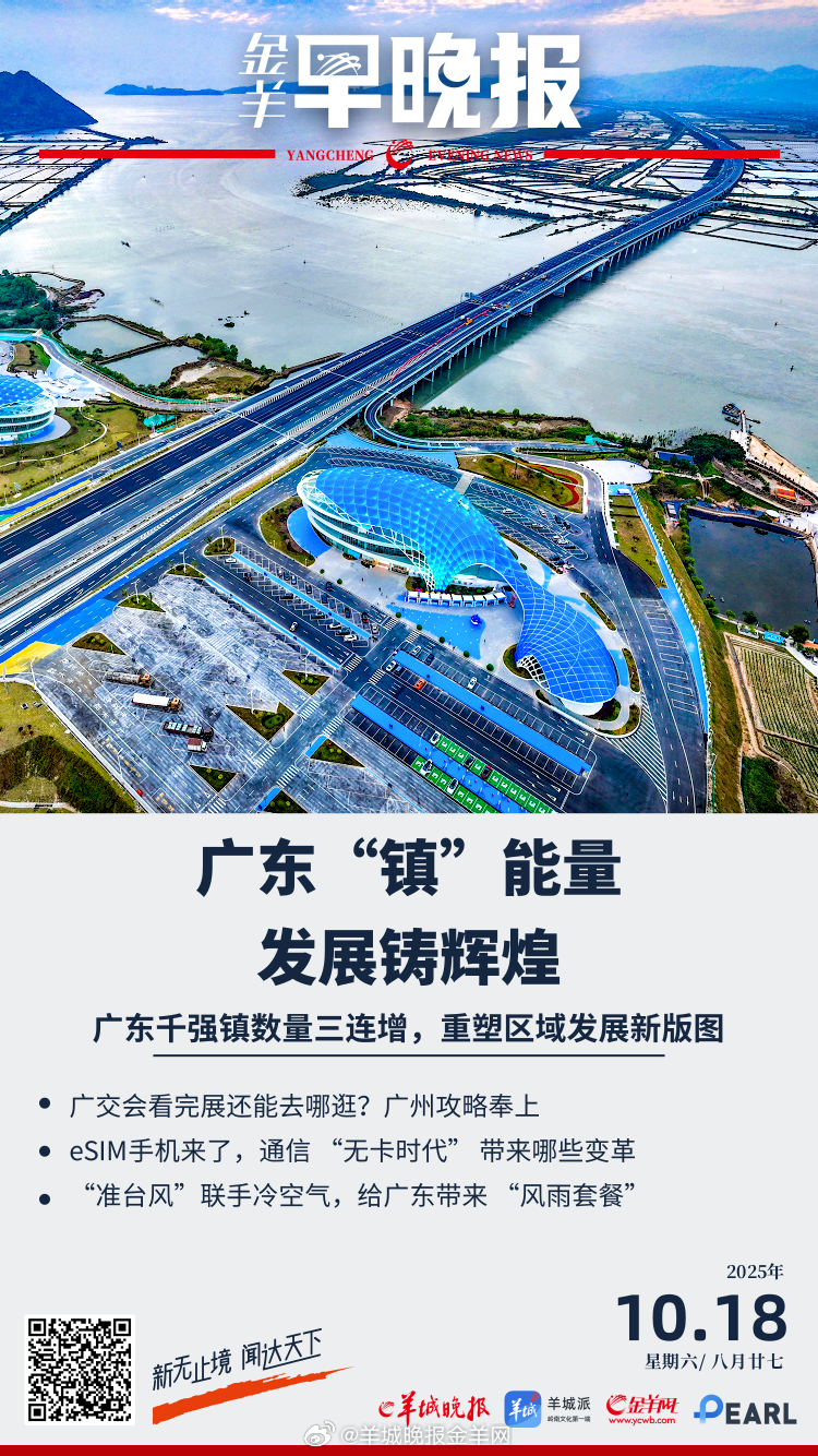 #金羊早晚报#三大千亿镇领跑,千强镇数量三连增!广东“镇”能量重塑区域发展新版图;手机厂商齐推eSIM手机,通信 “无卡时代” 带来哪些变革?;又一“准台风”生成!联手冷空气,给广东带来 “风雨套餐”;广交会看完展还能去哪逛?广州攻略奉上;28岁男演员被曝酒后殴打他人,已被关入看守所;500平房子装20余台空调?邻居无奈投诉;兄弟反目?周杰伦隔空怒撕好友:再不出现,你就完了!;毕加索一画作在西班牙参展途中失踪;#杨力维杨舒予父亲去世#更多精彩报道,请扫码关注羊晚全媒体报道!
