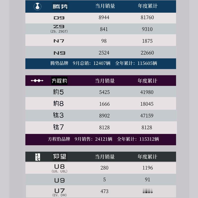 比亚迪上个月卖得最好的还是秦,其次才是海狮和海豹! 9月份总共卖了393060辆车,其中腾势12407辆、方程豹24121辆、仰望758辆,海洋和王朝依然是销量担当: 秦:67588 元:45291 宋:24089 唐:13620 汉:8690 夏:3384 --------分割线-------- 海狮:54065 海豹:51359 海鸥:34586 海豚:21888 宋Plus:18089 驱逐舰05:9250 E2荣耀版:127 作图:小迪快报 感觉还是便宜的车型好卖,秦发挥稳定,方程豹增长明显,腾势在下滑…