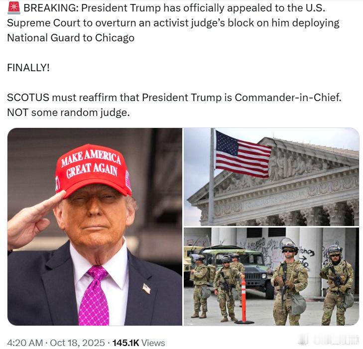 特朗普总统已正式向美国最高法院提出上诉,要求推翻一名激进法官阻止他向芝加哥部署国民警卫队的裁决。