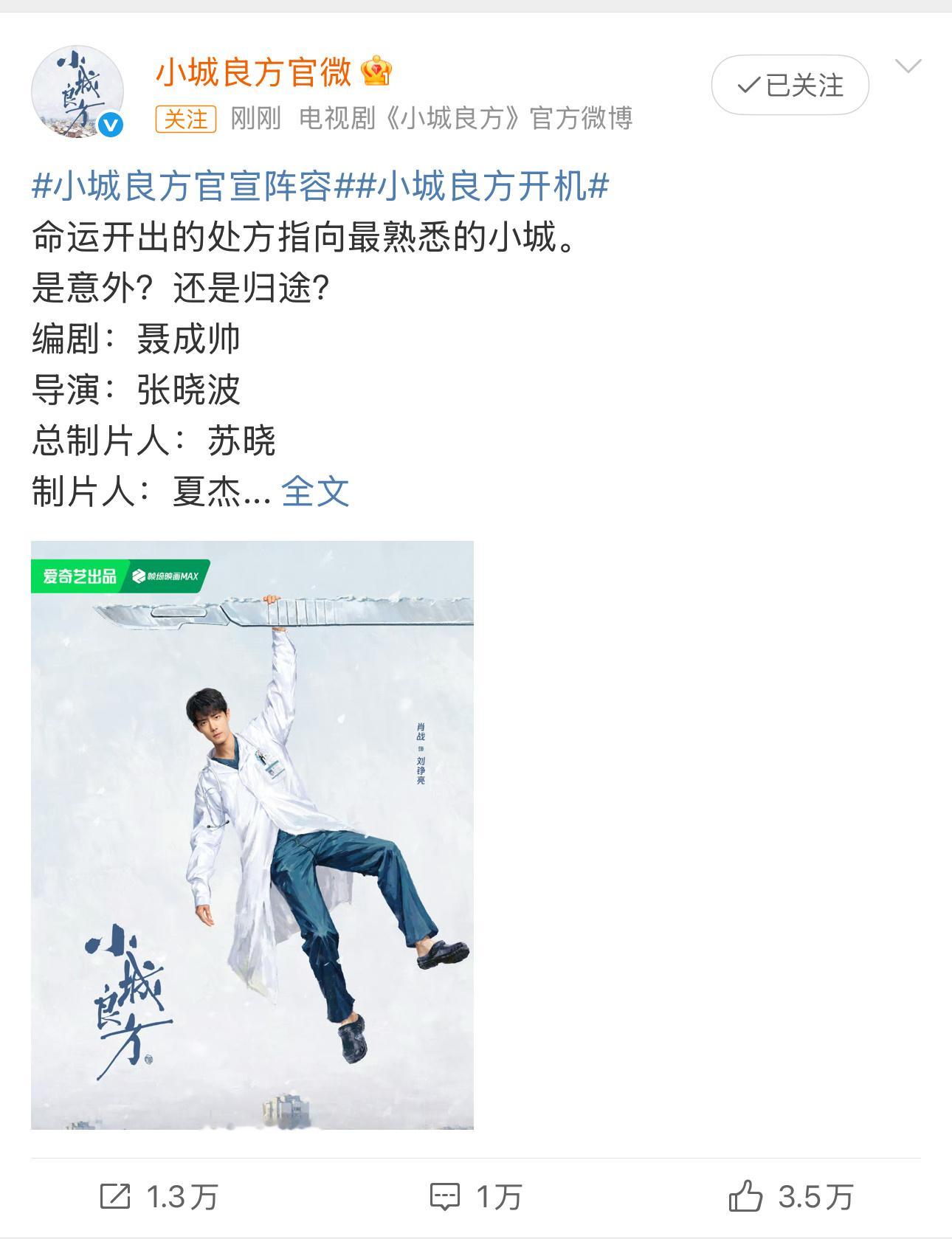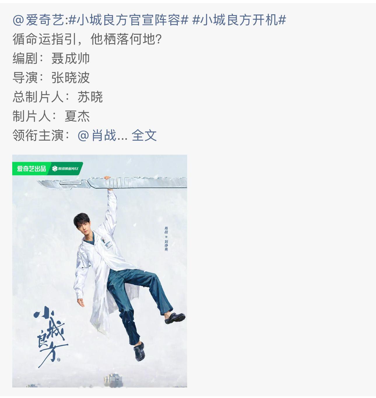 柠檬影视、爱奇艺、小城良方官微一起官宣大男主现实题材都市剧小城良方开机。