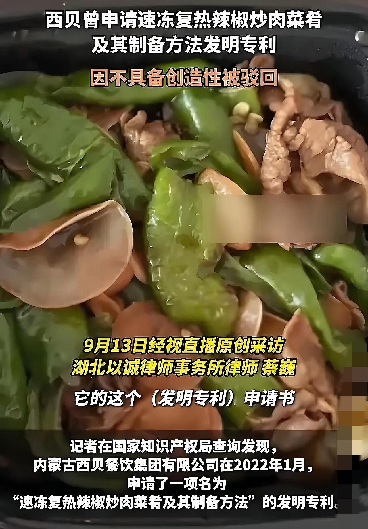 西贝申请“辣椒炒肉”专利被驳回,这事儿一点都不冤! 说实话,要是这种申请都能通过,那专利局真该改名叫“玩笑局”了。 问题不在申请本身,而在于他们连最基本的专利要素都没搞清楚。辣椒炒肉是国民家常菜,从辣椒的品种、产地、切法,到肉的选择、部位、形状,每一步都千差万别。 西贝既没提供标准化的制作流程,也没有独特的技术创新,就想把这道菜据为己有?这不是把专利制度当摆设吗? 真正的餐饮创新,应该体现在口味的独特调配、烹饪工艺的改良,或者食材搭配的突破上,而不是试图垄断一道流传已久的家常菜。 这种做法不仅难以服众,还可能损害品牌形象。 你觉得餐饮企业应该如何正确运用知识产权保护自己的创新呢?欢迎分享你的看法!