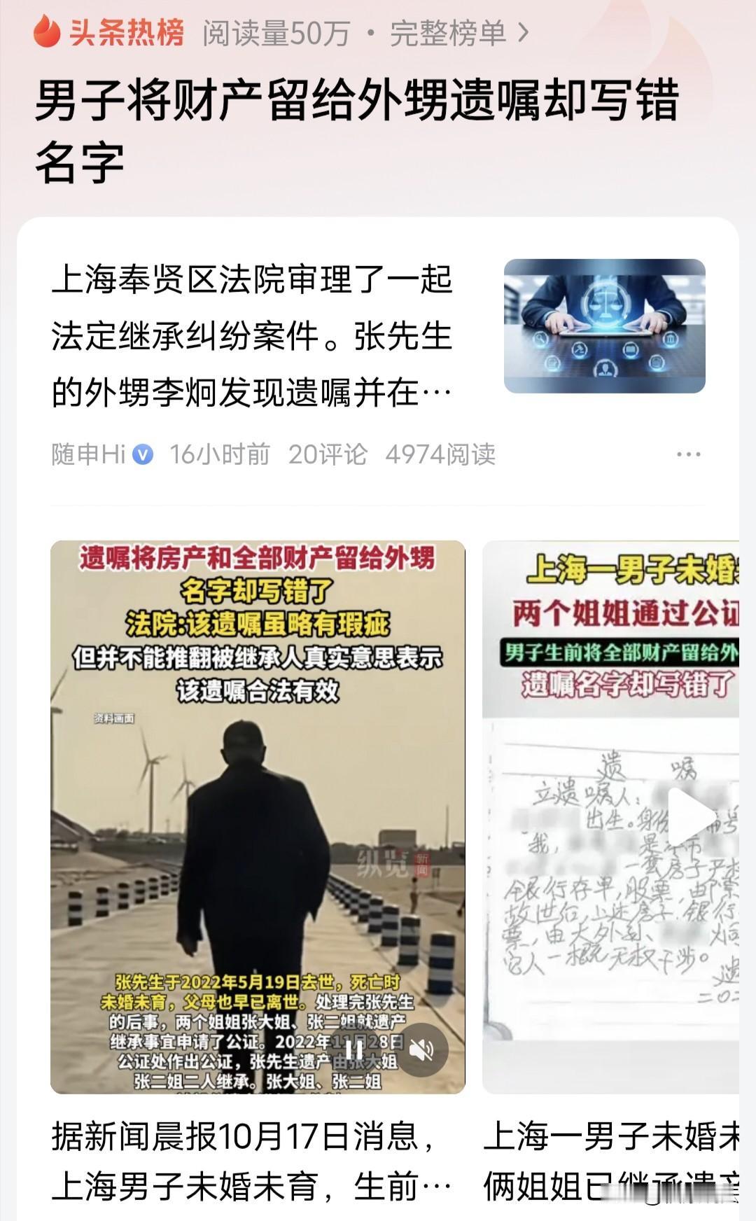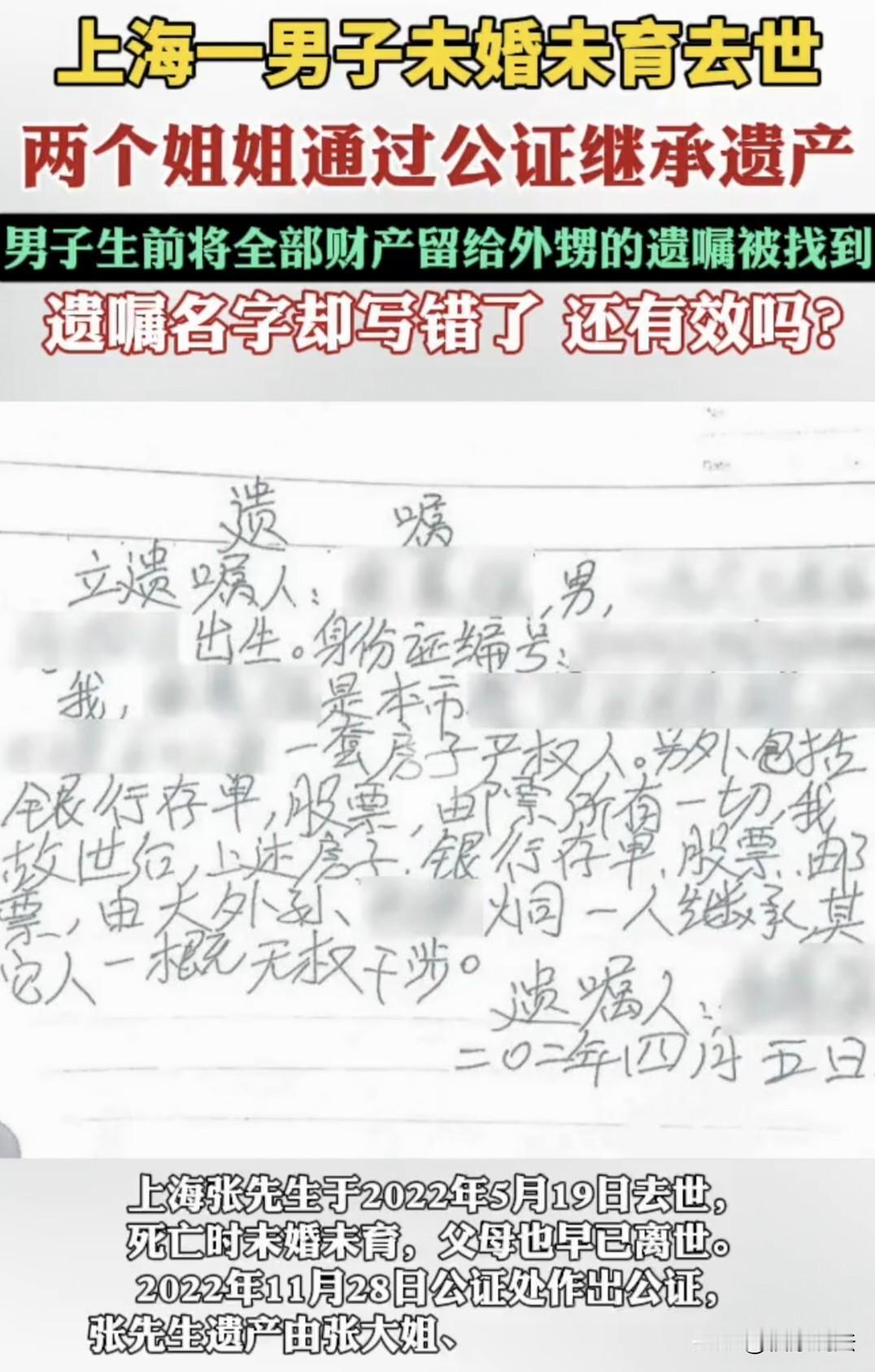 上海,男子一辈子没结婚,去世后,他的大姐、二姐公证后继承其遗产,二姐的儿子整理遗物时发现舅舅留下一份遗嘱,房子、股票、银行存单都归他一人继承,于是,男子把遗嘱照片发给母亲,由母亲转给大姨,不料,大姨不认可,认为遗嘱里“外甥”写成了“外孙”,“李炯”写成了“李烔”遗嘱应当无效,法院判决有亮点。 2022年5月19日,张先生去世了,他这一辈子没结婚,也没孩子,父母也早早离世了。 张先生去世后,留下不少财产,房子、股票什么的。 他的两个姐姐张大姐和张二姐觉得弟弟去世后,遗产就应该由她俩平分。 于是,姐妹俩去公证处办了遗产继承公证,公证显示张先生的遗产由她们俩继承,之后姐妹俩还分了部分遗产。 可没想到,2023年3月11日,张二姐的儿子、也就是张先生的外甥李炯,在整理张先生遗物时,发现了一份遗嘱,让他有些意外,亦有些感叹舅舅的良苦用心。 这份遗嘱上写着,张先生名下的一套房产,还有银行存单、股票、邮票等所有东西,在他去世后都由“大外孙李烔”一个人继承,其他人没资格干涉。 李炯看完遗嘱心里不禁酸楚,回想起和舅舅相处时的点滴,他心里很是感动。 同年3月13日,李炯通过微信告诉母亲张二姐,我发现了遗嘱并且接受遗赠,还把遗嘱照片发给了张二姐。 当天,张二姐觉得这事得告诉姐姐,于是,她又将儿子李炯发给自己的照片和内容转发给了张大姐。 有时候,再亲的亲人在钱财上面一时存有贪心,那么矛盾也就来了,张大姐看到妹妹发来的遗嘱,知道外甥李炯要继承张先生那么多的遗产心里突然不平衡了,她不认可遗嘱里的内容。 张大姐是有理由的,她觉得张先生从来没跟别人说过有这份遗嘱,也没把遗嘱和重要文件放在一起,这遗嘱可能不是张先生真实想处理财产的意思。 而且还有重要的一点,她仔细看了遗嘱里竟然有错别字,“外甥”写成“外孙”,“李炯”写成“李烔tóng”,落款日期也不符合要求,所以,她认为遗嘱不应该有效。 另外,张大姐还说李炯没证据证明他在知道能继承遗产后的60天内,表示过要接受遗产。 可李炯觉得这份遗嘱是舅舅张先生真实意思的表达,而且,自己也在规定时间内明确表示接受遗产了。 所以,张大姐和张二姐之前在公证处做的法定继承不算数,遗产应该由自己按照舅舅留下的遗嘱来继承。 原本的亲人因为一份遗嘱最终闹上了法庭…… 1、张大姐认为,李炯没证据证明他在知道能继承遗产后的60天内,表示过要接受遗产。 《民法典》第1124条规定:受遗赠人应当在知道受遗赠后六十日内,作出接受或者放弃受遗赠的表示;到期没有表示的,视为放弃受遗赠。 在这件事中,李炯在2023年3月11日发现了遗嘱,3月13日就通过微信向张大姐和张二姐表示接受遗赠,还提供了短信和微信聊天记录作为证据。 这表明李炯在知道接受遗赠的60天内,表示接受舅舅张先生的遗产。 假如,要是李炯没有在这60天内表示接受,按照法律规定,就等于他放弃了这个遗赠,不能再继承遗产了。 所以,受遗赠人一定要在规定时间内表明自己的态度。 2、张大姐认为遗嘱中有错别字,不该有效,法院会怎么认定呢? 《民法典》第1134条规定:自书遗嘱由遗嘱人亲笔书写,签名,注明年、月、日。 在这起案件里,张先生留下的遗嘱中把“李炯”写成“李烔”,把“外甥”写成“外孙”。 不过法院考虑到张先生的受教育程度、沪语和普通话发音差异,而且张先生也没有外孙,也没有和李炯名字相近的其他亲戚。 所以,法院认定遗嘱里说的“大外孙李烔”就是李炯。 这说明错别字不一定让遗嘱无效,只要不影响理解张先生想让外甥李炯继承财产的真实想法就行。 3、李炯认为张大姐、张二姐的公证处所做的法定继承无效,自己有权按照舅舅留下的遗嘱继承。 《民法典》第1123条规定:继承开始后,按照法定继承办理;有遗嘱的,按照遗嘱继承或者遗赠办理;有遗赠扶养协议的,按照协议办理。 按照法律规定,在处理遗产继承问题时,如果有有效的遗嘱存在,那么遗产的分配就要依照遗嘱来进行,而不是按照法定继承。 在这个案例中,张先生留下了自书遗嘱,明确表示在他去世后,房产、银行存单、股票、邮票等所有财产由“大外孙李烔”(实际为李炯)一人继承,其他人无权干涉。 这就意味着,法院只要认定这份遗嘱是合法有效的,就应该按照遗嘱的内容来分配遗产。 而不是按照之前公证处作出的由张大姐、张二姐二人继承的法定继承方式。 最终,法院判决:由李炯继承遗嘱所称遗产。 张大姐不服上诉,二审维持原判。 关注@福康说法 从日常点滴学法律,生活安稳更有底