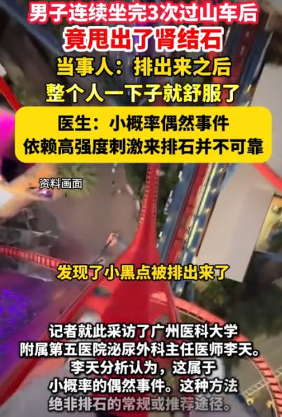 10月13日,一男子在游玩过山车的时候,突然感觉下半身出现一股尿意,他赶紧跑到厕所排泄,没想到竟然尿出了一块“黑色石头”,男子惊讶的发现困扰了自己多年的肾结石,竟然自愈了!医生网友:这可不是好事! 10 月 13 日,一则 “男子坐过山车意外排出肾结石” 的消息在社交平台悄然发酵,虽未登上热搜顶端,却因事件的戏剧性引发不少关注。 当天上午,这名不愿透露全名的男子和朋友约好去本地一家老牌游乐园游玩,原本只是想借周末放松心情,却没料到这场普通的娱乐之行,竟解决了困扰他近三年的老毛病。 据男子事后回忆,他当天最先体验的是园区里最热门的 “极速飞轮” 过山车,全程近 2 分钟的行程里,过山车不仅有连续的高空俯冲,还有 360 度的高速翻转。 起初他只是觉得刺激,可当过山车进入后半程的密集颠簸段时,他突然感到下腹部传来一阵轻微的坠痛,紧接着强烈的尿意涌了上来。 “当时还以为是紧张导致的,毕竟过山车速度快,身体容易有应激反应,没多想就硬扛到项目结束。” 项目一停,他顾不上和朋友汇合,捂着肚子快步冲向就近的厕所。 排泄过程中,他明显感觉到有个硬物顺着尿道滑落,伴随着轻微的刺痛感。 随后便听到 “嗒” 的一声轻响,低头一看,便池底部躺着一颗直径约 3 毫米的黑色小石子,表面还带着些许光泽。 “那一刻我愣住了,反应了好几秒才意识到,这可能就是我一直没排出来的肾结石!” 原来,男子早在三年前就被查出患有肾结石,当时结石直径约 5 毫米,医生建议他通过多喝水、做跳跃运动促进自行排出。 这三年里,他每天坚持喝 2000 毫升以上的温水,还特意买了跳绳,每天早晚各跳 15 分钟,甚至尝试过中医推荐的排石茶。 可每次去医院复查,结石要么位置没变化,要么只是轻微移动,始终卡在输尿管中段,偶尔引发的腰腹隐痛和排尿不畅,让他备受困扰。 这次结石排出后,他当即给医生发了消息,描述了事情经过。 当天下午,他还特意去药店买了尿液检测试纸,确认尿液中没有红细胞,才稍微放下心来。 “之前总听说有人靠颠簸排石,比如坐拖拉机、走山路,但我一直没敢试,没想到坐过山车反而误打误撞成了。” 不过,即便解决了心头大患,男子也保持着清醒。 他在和朋友分享时反复强调,自己能成功排石,大概率是多重巧合叠加的结果:“首先结石本身已经变小了,可能这两年多喝水有效果。 其次当时结石位置刚好到了输尿管下段,离尿道口近。” 他还提到,事后查了不少资料,发现有网友尝试模仿类似方式,结果结石没排出来,反而因剧烈震动导致输尿管划伤。 最后只能手术治疗,“所以真的不建议大家学我,每个人情况不一样,盲目尝试太危险。” 接下来,男子计划下周去医院做全面检查,确认肾脏内是否还有残留结石,输尿管是否有损伤。 他也想通过自己的经历提醒更多人:“有结石问题一定要听医生的,别相信所谓的‘偏方’或偶然案例,娱乐项目终究是娱乐,不能当治病工具,健康这事容不得半点侥幸。” 对此,有网友表示,这过山车是隐藏的‘排石神器’吧?建议游乐园出个结石专属票,比吃药省事儿还刺激!” 还有人羡慕:“我当年排石喝了俩月水、跳废一根绳,早知道去坐过山车,这运气也太绝了!” 也有网友结合自身经历提醒:“别光羡慕,我表哥之前结石卡得疼,学人家坐颠簸车,结果疼得更厉害,最后还是手术解决的。” 还有理性声音:“这就是巧合!结石大小、位置不一样,盲目学很危险,有问题还得听医生的,别把娱乐项目当治病方法。” 那么到最后,你们是怎么看的呢? 如果各位看官老爷们已经选择阅读了此文,麻烦您点一下关注,既方便您进行讨论和分享,又能给带来不一样的参与感,感谢各位看官老爷们的支持!