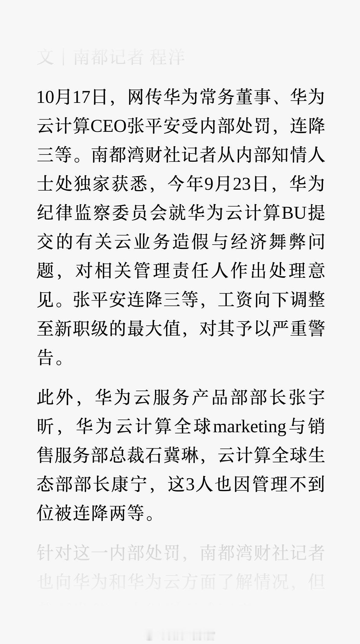 网传华为常务董事、华为云计算 CEO 张平安受内部处罚,连降三等。