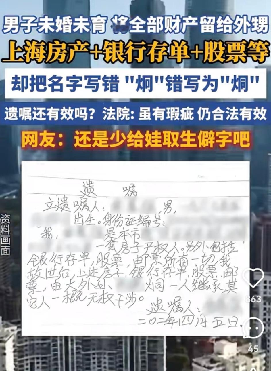 男子去世留遗嘱,结果把继承人的名字写错了!“外甥”写成“外孙”,“李炯”写成“李