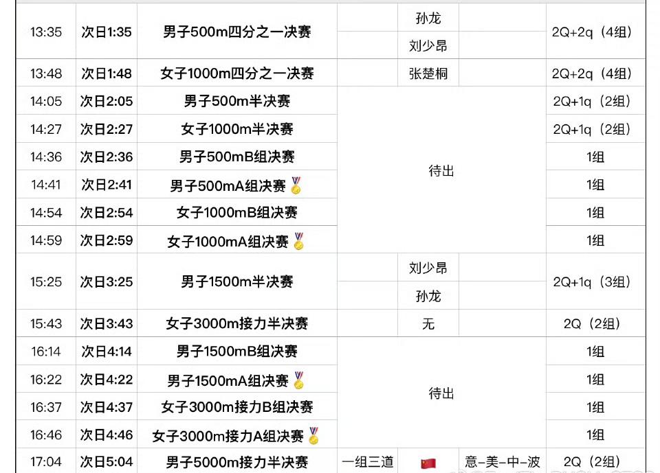 北京时间今晚开始,短道速滑世巡赛第二站进入第一个决赛日,中国队参加的比赛将在北京时间明天凌晨开始。 在本站第二比赛日的比赛中,中国队表现平平。林孝埈在男子1000米复活赛第一轮中,小组第一晋级。女子1500米1/4决赛,中国队张楚桐晋级,公俐和臧一泽将参加复活赛。中国队在男女混合2000米半决赛中,范可新摔倒,中国队无缘FA,将在今天出战FB。 在北京时间今晚开始的第三比赛日的比赛中,中国队没有队员参加男子500米、1500米和女子1000米的复活赛。 北京时间明天凌晨,1:35,孙龙和刘少昂将参加男子500米1/4决赛。1:48,张楚桐参加女子1000米1/4决赛。随后,将产生这两个项目的冠军。 3:25,孙龙和刘少昂将参加男子1500米的半决赛。之后还将进行女子3000米接力的半决赛和决赛,中国队无缘半决赛。 最后一项是明天5:04开始的男子5000米接力的半决赛,中国队一组3道出发,同组还有意大利、美国、波兰。