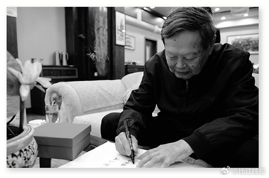 演讲结束后,杨老先生还特地为《钱江晚报》读者题字“学无止境”,拿着马克笔一笔一划写得极为认真。