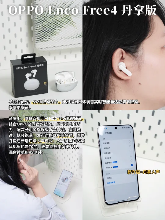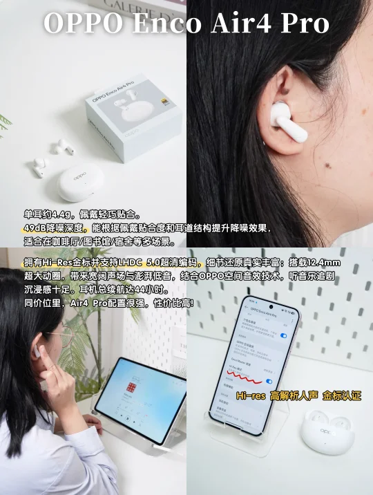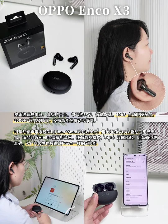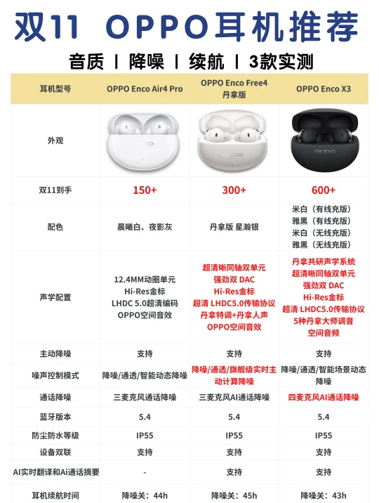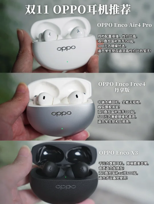 双十一想要选入耳式蓝牙耳机,可以考虑OPPO耳机,兼顾降噪和音质,适合学生党和上班族以及音乐发烧友! Tina分享热门三款OPPO耳机从入门到旗舰级,帮助宝子们选到适合自己的耳机。 三款OPPO耳机相同点: 双设备连接,在手机平板等设备无缝切换。 开盖即连,弹窗能设置个性化主题可玩性高。 都有IP55级防尘防水,hi-res金标及支持LHDC5.0,通话降噪等~ 三款OPPO耳机独特优势: [种草R]OPPO Enco Air4 Pro: 单耳约4.4g,佩戴轻巧贴合。49dB降噪深度,能根据佩戴贴合度和耳道结构提升降噪效果。 搭载12.4mm超大动圈,带来宽阔声场与澎湃低音,结合OPPO空间音效技术,听音乐追剧沉浸感十足。耳机总续航达44小时。 [向右R]同档配置很强,性价比高,双11叠加国补到手150起,300元内降噪优选,适合学生党及追求高性价比的宝子! [种草R]OPPO Enco Free4 丹拿版: 单耳约4.7g,55dB降噪深度,能根据周围环境音实时智能自适应调节降噪,降噪更舒适。 音质上,同轴双单元+LHDC 5.0超清编码,结合OPPO空间音效技术,能带来高解析力,层次分明的旗舰级听音体验。 发布时搭载的丹拿特调,固件升级后新增丹拿人声模式,属于越用越有的机子!人声降噪在安卓耳机里也是T0的,更是能媲美苹果耳机。混合续航约45小时。 [向右R]中端水桶耳机,全能无短板,越级旗舰体验! 双11叠加国补到手300起,500元内兼顾降噪和音质,适合学生党和上班族。 [种草R]OPPO Enco X3: 皮质纹理充电仓,高级感十足。单耳约5.3g,佩戴舒适。50dB 主动降噪深度,5500Hz超宽频降噪,支持智能场景动态降噪。 丹拿共研声学系统采用11mm+6mm同轴双单元,搭配强劲双DAC驱动,细节丰富,适合聆听Hi-Res高解析音乐。 有5种丹拿大师调音,能根据音乐类型定制。还有游戏模式,54ms 超低延迟,听音辨位更准确。 支持全场景空间音频,无论使用OPPO还是水果机都能获得沉浸式听音! X3 升级后也具备跟Free4一样的ai功能! [向右R]千元内旗舰耳机,降噪媲美苹果,音质适合发烧友!双11叠加国补zui低600起,适合多设备党使用!