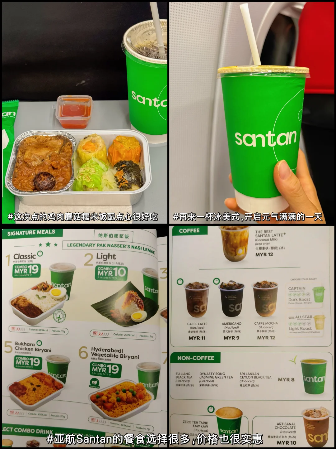 🍴机上可以试试Santan餐,这次飞行我预定了鸡肉蘑菇糯米饭点心+ 冰美式,味道很不错,还有空乘的热情服务,从乘机这一刻开启元气满满的一天,提前24小时在官网订还能低至8折,很划算