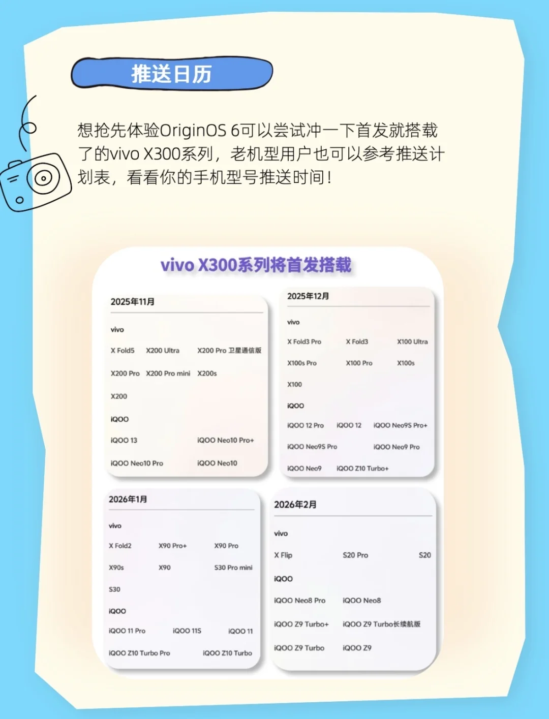 想抢先体验OriginOS 6可以尝试冲一下首发就搭载了的vivo X300系列,老机型用户也可以参考推送计划表,看看你的手机型号推送时间!