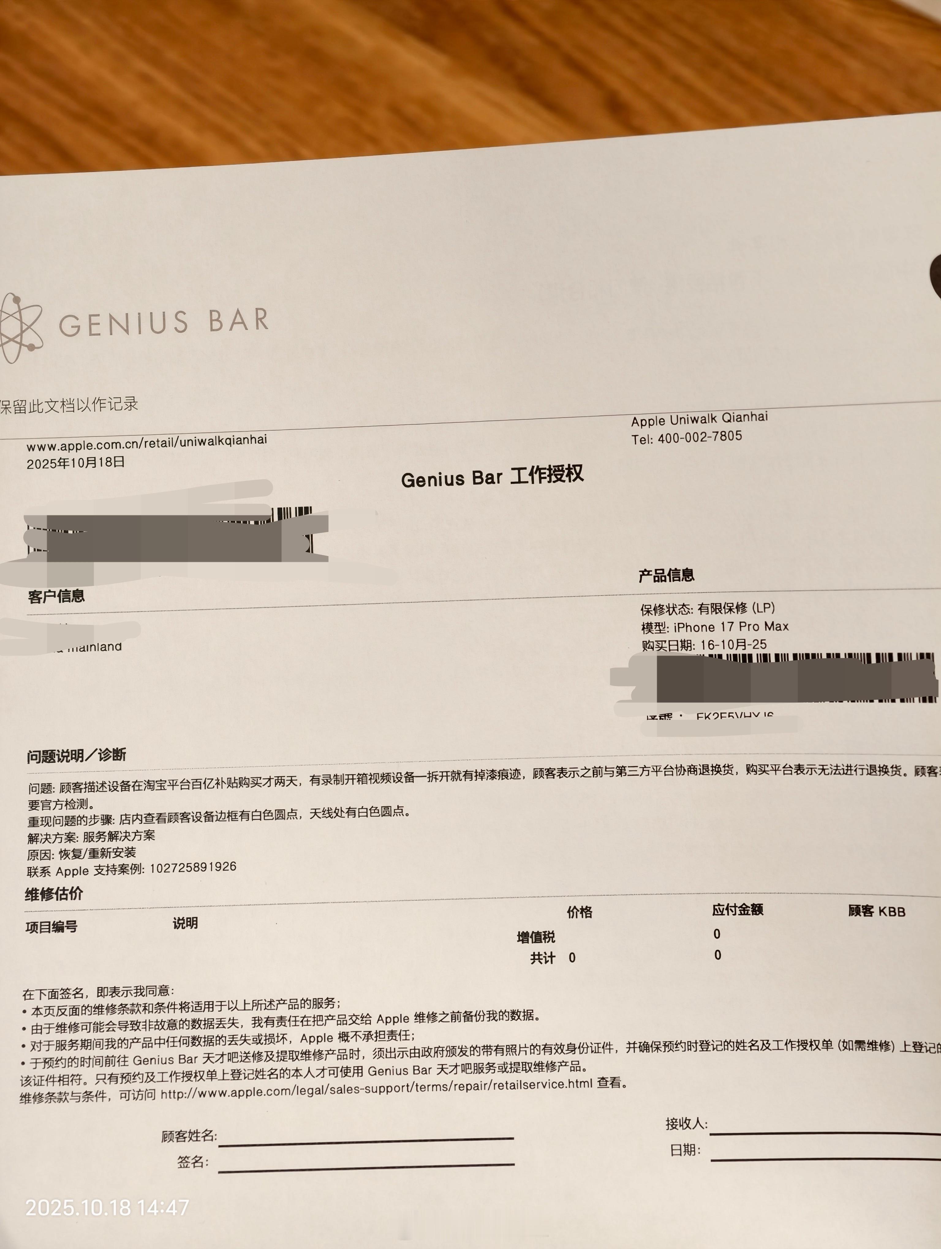来了苹果天才吧,我买的新iPhone 17pro max.开箱发现掉漆,快递小哥激活了,淘宝不能退,苹果官方售后“掉漆不属于售后范围”[允悲]