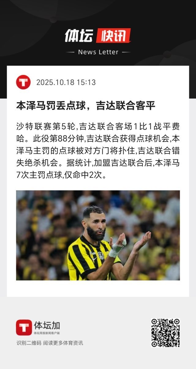 加盟吉达联合后,本泽马7次主罚点球,仅命中2次。
