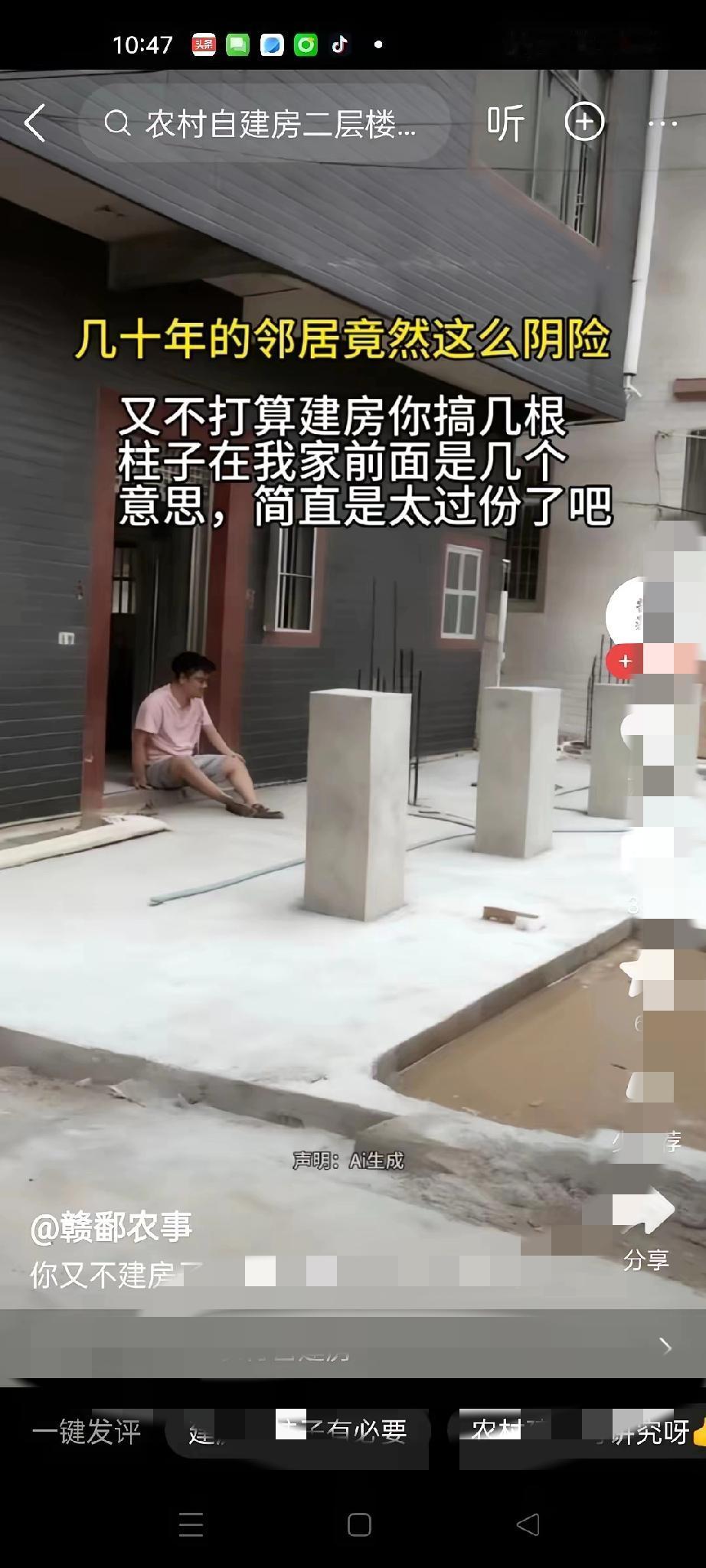 瘫坐在自家门口盯着那几根碍眼的石柱, 男子心里堵得发慌。 谁能想到,这竟是几十年老邻居的“杰作”——明明是邻居家的宅基地,却偏把石柱立在别人大门口,不建房不利用,纯纯就是故意添堵。平日里装得人模人样,关键时刻的阴险操作,真是颠覆了多年的邻里情。 其实邻里相处,图的就是个和睦舒心,低头不见抬头见的情分,远比那点无关紧要的地界之争金贵。所谓“远亲不如近邻”,从来不是一句空话,而是需要双方用心维系的默契。 可总有人把恶意当本事,用损人不利己的手段消耗人情,最后只会落得孤立无援的下场。 好的邻里关系是生活的加分项,坏的邻里却能让人身心俱疲。你身边有过这样糟心的邻里矛盾吗?遇到这种事,你会怎么处理?