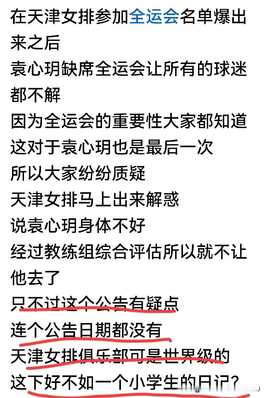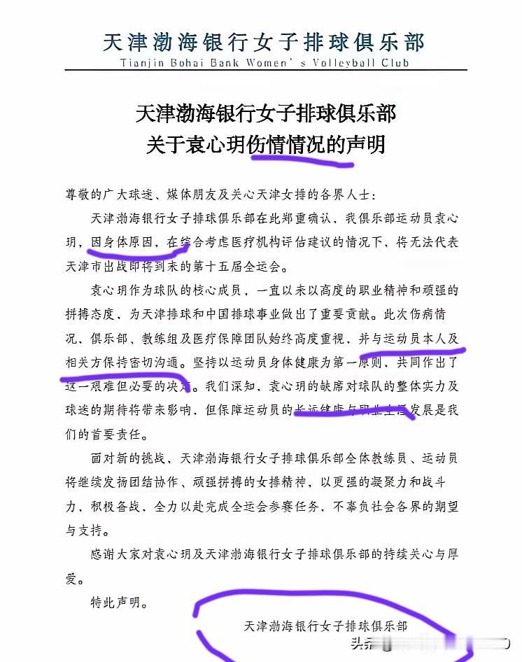 [玫瑰][玫瑰][玫瑰][玫瑰]天津渤海银行女子排球俱乐部发声明,由“声明”变到“天津渤海银行女子排球俱乐部关于袁心玥伤情情况的声明”,间隔时间不长,内容完全一致,只是标题不同,落款完全一致,但都没有显示具体的日期和加盖公章。如此行文,不仅极不规范不严谨,而且其“声明”的真假,不得不让人产生怀疑。 另外,天津女排将要参加的是15届全运会,而不是参加由俱乐部队组成的排超联赛。袁心玥因“身体原因和伤情情况”不能参加,发“声明”和“伤情情况”理应由天津女排或天津排管中心发文说明,怎么会张冠李戴,由天津渤海银行女排俱乐部发文声明呢?天津女排与天津渤海银行女子排球俱乐部队不是一回事,这点难道发文方不清楚吗? “声明”说是“关于袁心玥伤情情况的声明”,然只说是“身体原因”,至于是什么“伤情情况”,天津渤海银行女子排球俱乐部〝声明”中闭口不谈,只用“身体原因”一笔带过,而没有将“情况”加以说明。众所周知:“身体原因与伤情情况”在概念和定义及内容上是有很大的区别与不同的。 看来这个“情况”有难言之隐,不方便说,也不能公开说。 袁心玥是九月份先到天津女排封闭集训,后又随天津女排集体远赴土耳其留洋打热身赛,再回到天津为备战15届全运会进行集训。到国庆节期间及以后,袁心玥在天津女排的相关报道和集训照片中,就再也没有看到袁的身影了。直到17日网上曝光出来的“声明”,人们才知道袁心玥已缺席15届全运会天津女排12人阵容大名单。并已乘机离开天津返回重庆。 总之,一纸“声明”和“关于袁心玥伤情情况的声明”的另一纸文疑点很多。不具有说服力和可信度。因为,没有日期和加盖公章的〝行文”,是没有公信度的,可视为P文或废文一件。