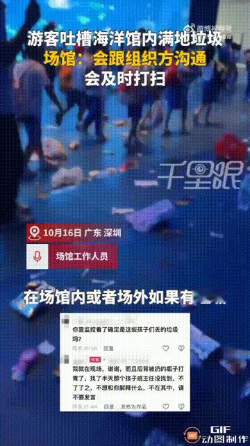广东深圳一处海洋馆内,一位游客进场馆游览时,遇到一群学生在组团参观,但这些学生从始至终都没有安静游览,不仅大吵大闹,而且还乱扔瓶子,等到最后离开时,更是在场馆内留下了满地的垃圾。 这位游客被瓶子砸中脑袋也没计较,但是最后看见遍地垃圾时,真的忍不住发视频吐槽,她表示这次在海洋馆的体验非常差,学生们不自律,老师们不作为,而园方纵容他们这样做,也影响了游客体验。 事后园方出来回应,表示这些学生看完演出后留下了不少垃圾,都会有保洁阿姨进行清理,后续会跟统一参观的组织单位沟通。 网友看完这段视频,都觉得这些孩子真的需要好好教育了,不随地乱扔垃圾,这是从上幼儿园就应该明白的道理,而且在公众场合,也不应该大声喧哗,这样会影响到别人,是非常不理智的行为,同时这些孩子的老师也没有尽到责任,对于他们的行为没有及时制止,这样听之任之,最后丢的都是自己和学校的脸面。大家怎么看呢?