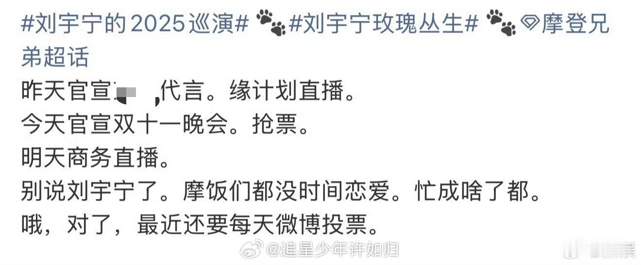 可把刘宇宁粉丝忙坏了 刘宇宁粉丝的日常:从早忙到晚!追剧、追综、听新歌是基础,演唱会跑断腿,番茄台晚会官宣后,痛车、大屏打卡连轴转,细化到小时的行程表太真实。 ​​​