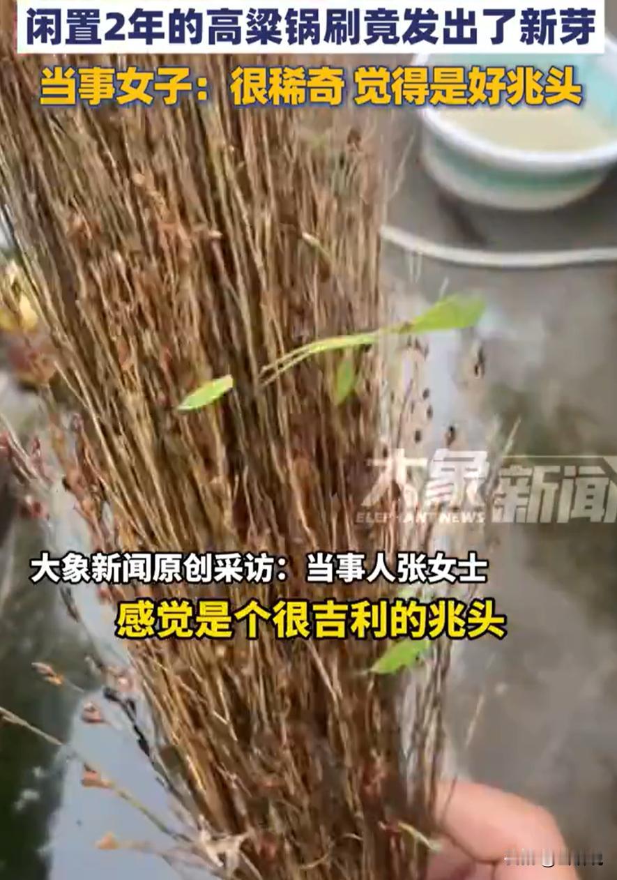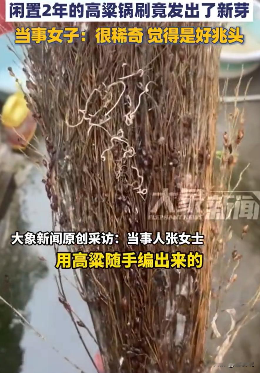 “这绝对是真材实料!”山东临沂,女生收拾屋子,突然在角落里找到一个锅刷,不过让她意外的是,由于最近连日下雨,锅刷竟然发出了绿油油地新芽! 张女士后来才想起,这是她奶奶两年前用高粱杆亲手编的,奶奶那时候随手编了几个饭帚、锅刷,说是用着结实、耐用、又环保。不过年轻人图省事,家里后来也买了塑料刷子,这个高粱锅刷就被随手塞进角落 本来她也早把这个东西忘在了脑后,最近天气连续下雨,湿度也比较大,找出来后,就发现饭帚已经发芽了 这事儿看着好玩,其实也挺有意思。现在家里用的清洁用品大多是塑料做的,用完就扔,根本不会再回到土里。而像这种高粱秆编的刷子,不光能刷锅,还能在阴湿的环境里重新发芽,算是自然循环的一种小奇迹 现在的人习惯了买新的,觉得旧东西没用,可有时候正是这些老物件,提醒我们什么才是真正的“好东西”。它不靠包装,不靠设计,就是凭着原料天然、做工扎实,能在角落里默默地长出一片绿