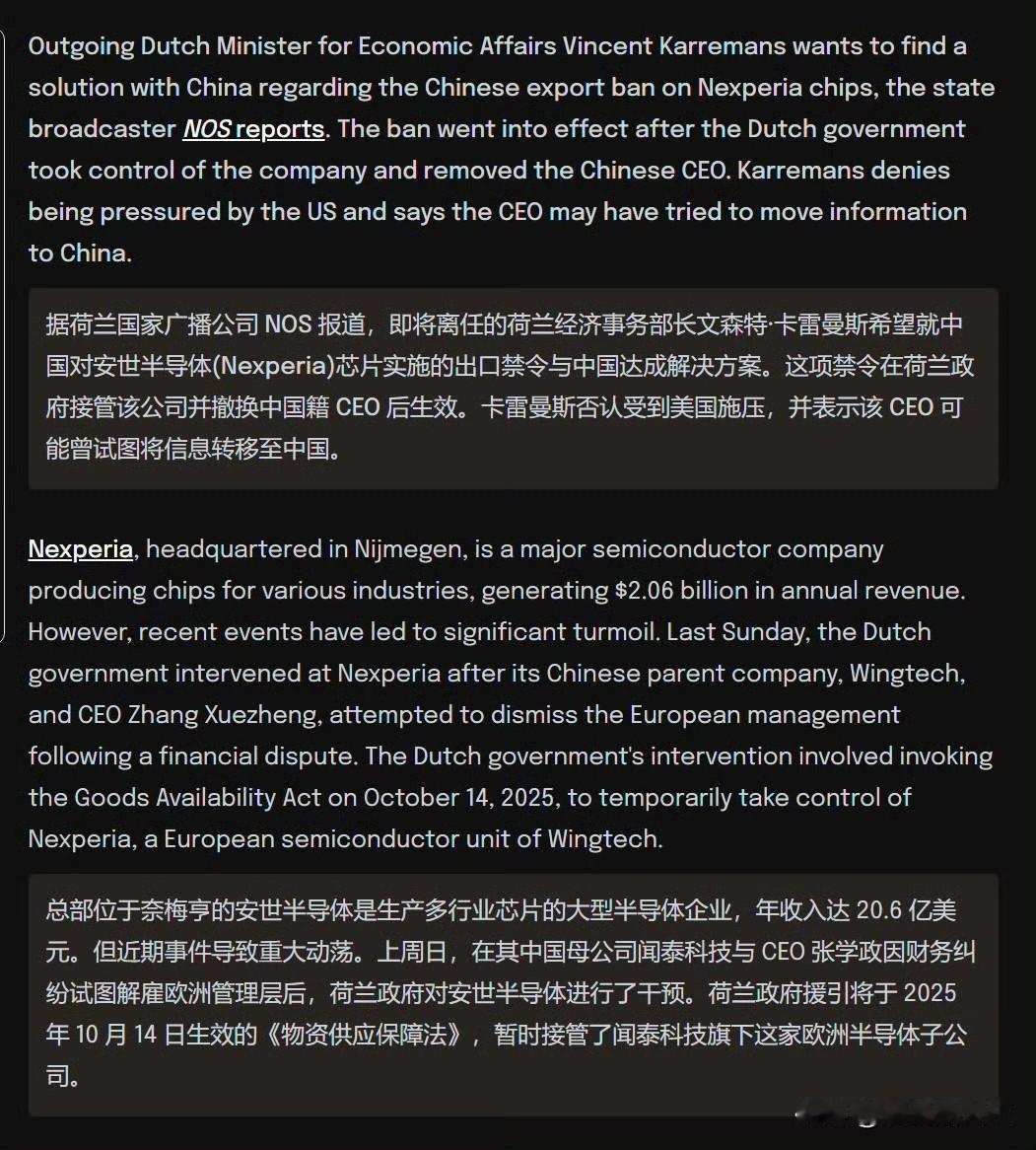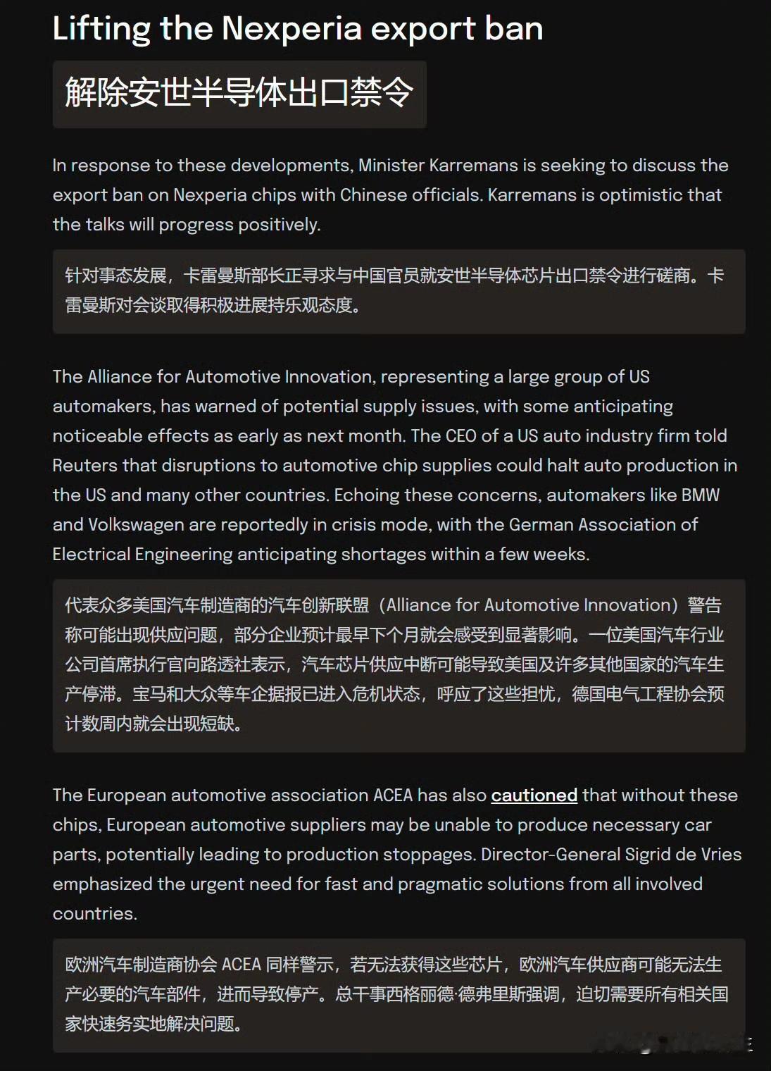乱套了,芯片禁令一出,不管是欧洲、还是美国,汽车生产可能都要停了。 代表众多美国汽车制造厂商的汽车创新联盟警告称,安世汽车芯片供应出现问题,预计最早下个月就会有汽车企业受到影响。某汽车制造商向媒体透露,汽车芯片供应中断可能 导致美国和欧洲国家的汽车生产陷入停滞,宝马和大众已经进入了危机状态。 事情到了这里,荷兰才忙不迭的站出来,荷兰经济事务部长称他从来没有下过命令接管安世。他希望和中国对安世半导体芯片出口禁令问题,寻求解决方案。 现在知道疼了,知道事情没有那么简单了,那当初强行接管安世的时候,为什么没有人和中方沟通呢。现在出口禁令一出,才知道来找中方协商,那你先说明一下为什么强行接管中企,接下来再谈其他问题。