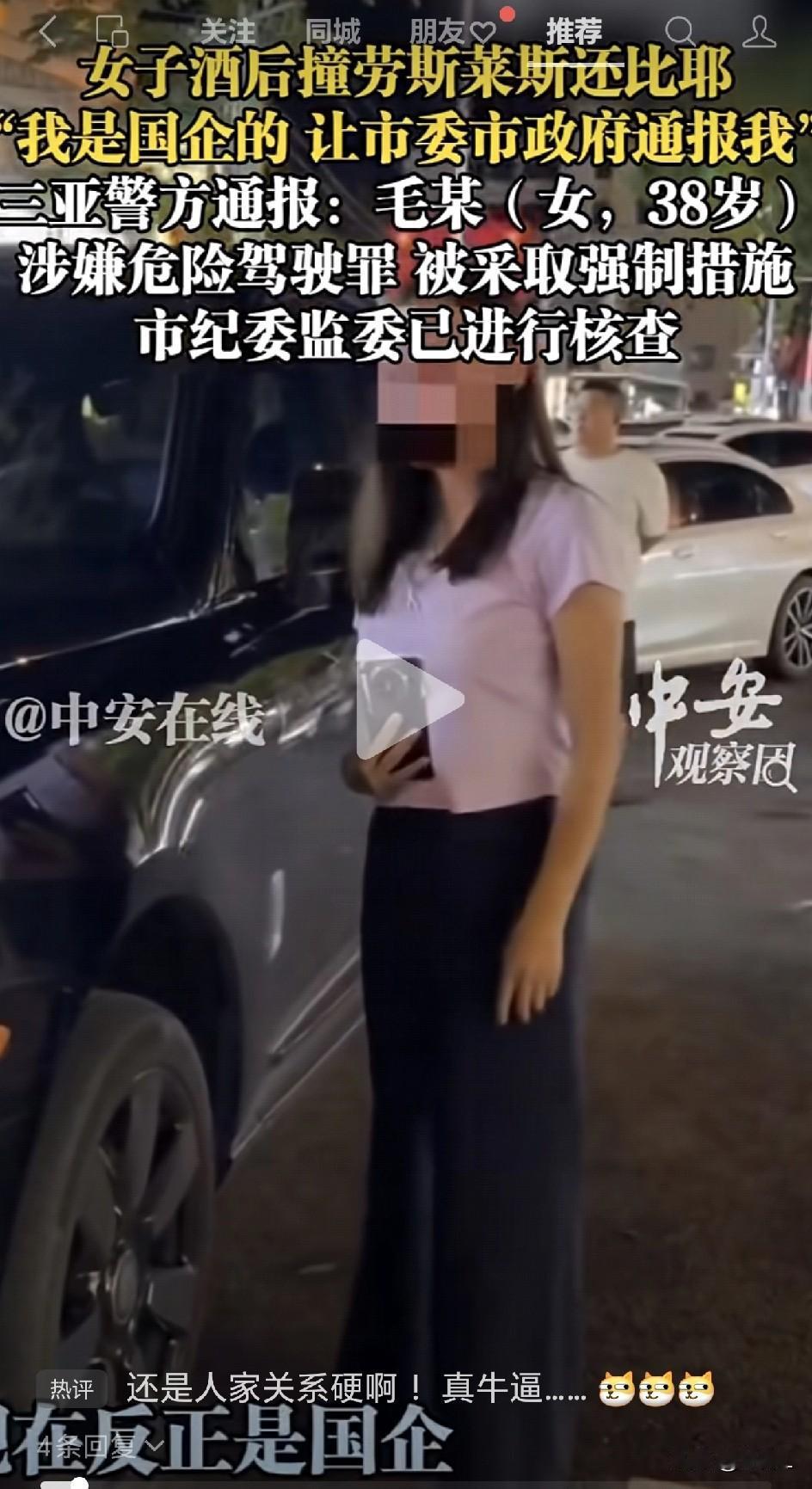 撞了劳斯莱斯,拒不配合检测,还对警察喊话:“我是国企的,让市委市政府通报我!”……三亚警方最新通报,结局舒适。 10月14日,海南三亚海棠区某加油站路段,某国企下属二级公司员工,38岁的毛某,酒后驾驶机动车倒车时,与劳斯莱斯发生刮碰。 面对警方的吹气检测酒精的要求,毛某拒不配合,情绪激动,并嚣张扬言:“我是国企的,让市委市政府通报我”。 结果也很舒适。 18日,三亚警方通报:毛某血液酒精含量达222mg/100ml,涉嫌危险驾驶罪,已被采取强制措施;车损问题已协商解决;市纪委监委同步介入核查。 网友的评论也都是绵里藏针: “牛掰啊!还是人家关系硬!” “国企啊,好了不起!” “38岁,貌美如花,年轻有为,不就是酒驾吗?国企领导看重你。” “怪不得大家打破脑袋要进国企。” “这类人说话确实有底气!” “跟谁喝的酒?让你如此有胆量?” “同样38岁,我望尘莫及!” “好好查查,到底跟谁喝的酒?” 自己醉驾,撞了别人的车,居然还敢叫嚣“让市委市政府通报我”? 这是得多无知无脑啊? 就像网友说的,国企了不起啊?国企这个平台是了不起,并不是你这个国企下属二级公司员工牛。离了平台,谁知道你是谁? 这下好了,求仁得仁,如你所愿了!市纪委监委同步介入了。醉驾入刑,牢饭也逃不了了。以后你可以去跟狱友刷存在感了,跟狱友喊你是国企的! 信息来源于中安在线,侵联删!
