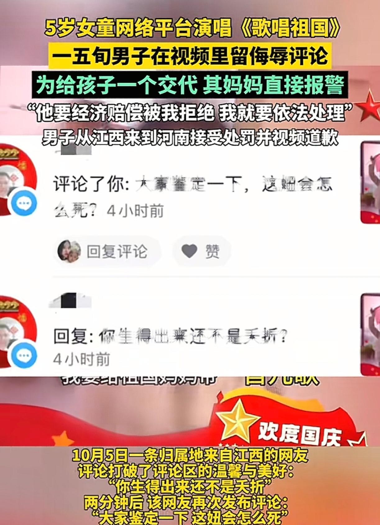 一个五岁的女童在十一期间在演唱《歌唱祖国》,被孩子妈妈发到了网上,不知道哪里招惹到男子,男子在视频下发表恶毒评论。孩子妈妈看到后果断报警。警察联系男子后,男子表示要经济赔偿,被孩子妈妈果断拒绝。实在让人不理解,一个大男人怎么能够恶毒成这样,感觉骨子里就透露着阴暗和扭曲,自己没有儿孙吗?一把年纪真是白活了。建议关个一年半载的,让他长长记性,让他知道网络不是法外之地。网络 素质