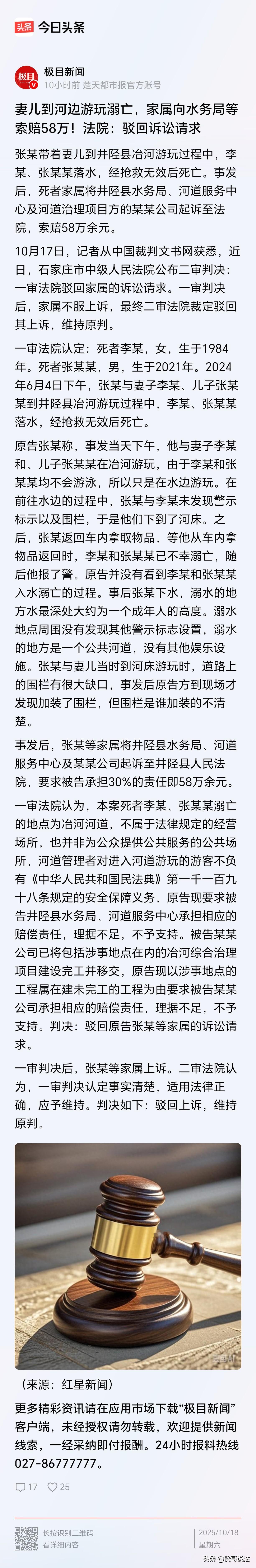 并非谁死谁有理!河北石家庄,一男子带妻子和孩子专门来到河边玩耍,岂料在此过程中,妻子和孩子不幸溺水身亡。事后,男子认为河边没有警示标志且旁边的围栏破损,便果断将当地水务局等主体告上法院,索赔580000余元,对此,法院的态度很明确。 这是真实发生在河北省井陉县的一个案件。 据极目新闻报道,在2024年6月份的一天,因天气炎热,男子张某便带着妻儿来到当地一处河道玩水消暑。 因妻儿均不会游泳,便只能在水边进行游玩。 就当张某回到车中拿东西时,悲剧发生了。 张某的妻儿不幸从河边落入水中,待张某返回时,妻儿已经不幸身亡。 事后,张某悲痛不已,他觉得妻儿遭遇如此祸患,与水务局、河道管理及治理等单位脱不了干系,理由是: 在事发地周围,相关责任单位并没有设置相应的警示标志,且旁边的围栏还有很大缺口。 正是因为上述主体的不作为,才导致自己的妻儿离世。 据此,张某坚决要求水务局等承担赔偿责任,提出赔偿金额共计580000余元。 有人说,“事情的发生要讲究前因后果!明明是张某带妻子和孩子来这个地方玩耍出事的,怎么能怪水务局呢?张某这是无理取闹!” “如果能判张某赢,岂不所有的河流、湖泊都要加装盖子了,不然出事,随便一告就有钱拿,何乐而不为呢?” 当然,张某因妻儿出事儿心情可以理解。但法律就是法律,法律是要讲究证据和事实的。 “并非谁死谁就一定有理!” 根据《民法典》的规定,对于像酒店、餐馆等这样的经营场所,或者是为公众提供服务的公共场所,经营者和管理者对顾客或游客存在一定的安全保障义务。 但对于本案而言,涉事河道并不属于经营或公共场所,水务局等主体对张某前来游玩所导致的悲剧并不负有安全保障义务。 在证据上,张某同样无法提供证据证明水务局等主体对他妻儿的死亡存在过错。 故最终,法院驳回了张某的全部诉讼请求。 张某不服,上诉,二审维持原判。 要知道,对于水务局等单位而言,即便他们存在一定的管理职责,但该职责也不应随意无限扩张! 对于如此广阔的水域,也更不可能做到面面俱到。 反观张某,作为一名成年人,明知在河边玩水有危险,明知妻儿不会游泳,人身安全得不到保障。 但张某仍然带着妻儿来到河边玩耍,最终酿成祸患,他才是最该反思的那个人! 对此,你怎么看呢?欢迎大家在评论区留言。 (注:图片仅供参考)