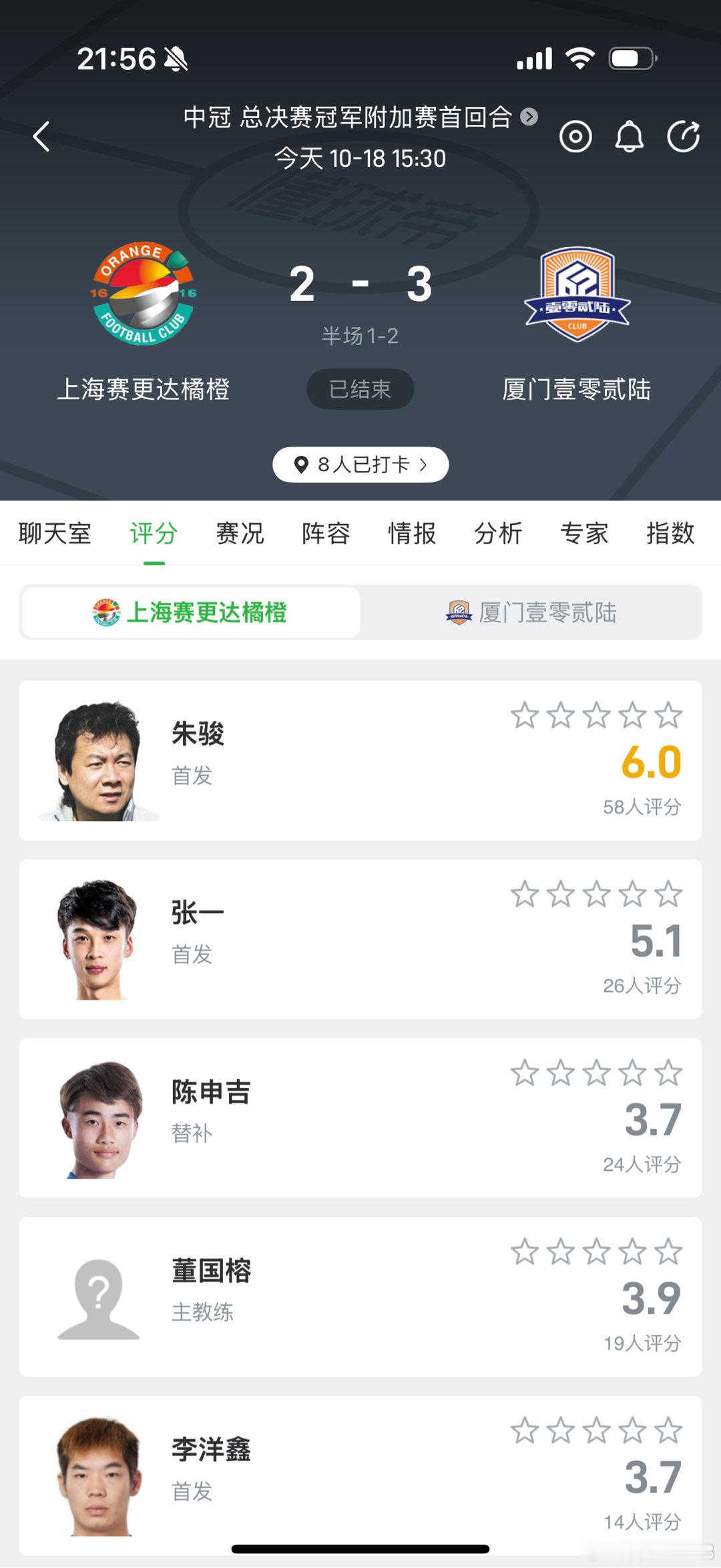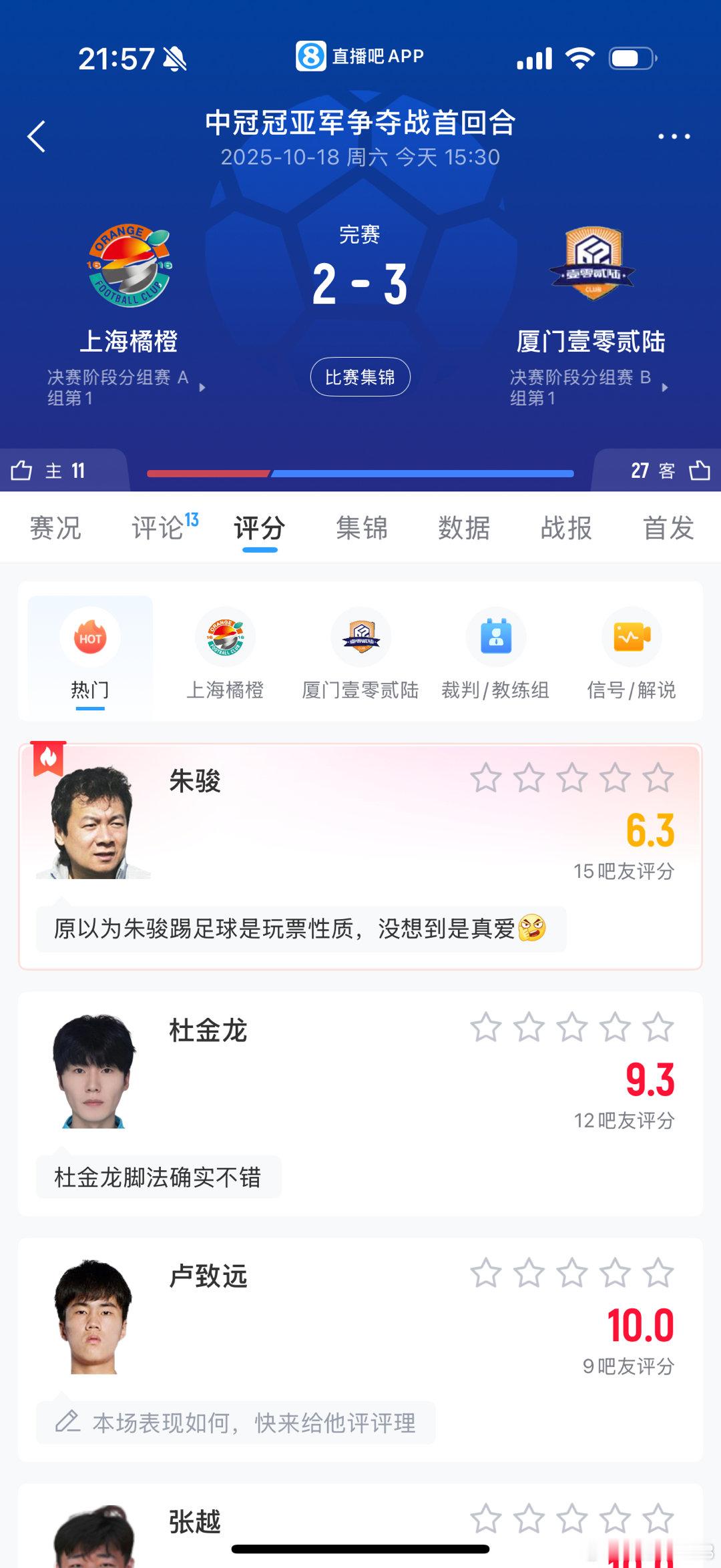 中冠决赛首回合,上海赛更达橘橙2:3厦门壹零贰陆队,59岁的朱骏身披16号球衣首发出场,踢了73分钟被换下场,赛后网友评分都达到6分,不知道次回合的比赛中,朱老板还有机会上场吗