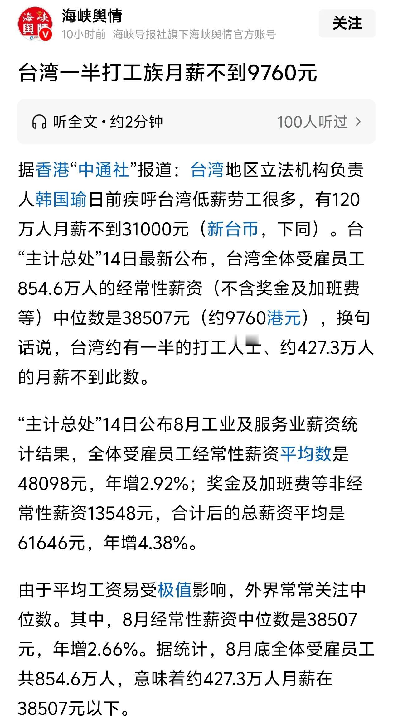 中国台湾工资高是假的?台湾不如中国大陆生活条件好?物价高企,民怨沸腾,这是真实的台湾吗? 在全世界所有国家和地区中,台湾地区的人均GDP都排行前列。在一千万以上人口的国家和地区中更是仅次于美国。毕竟是亚洲四小龙之一,当年和日本、韩国、新加坡一起驰名。所以民富程度和福利保障比中国大陆要做得更好。 但是,经济好是经济好。不是说就能成为台湾的借口。当年,香港在回归前的巅峰经济水平占大陆近1/4,澳门依靠博彩业也非常富裕,一样,还是要按时回归。回归之后一样没耽误港澳经济发展。 台湾回归也是一样,中国政府只会让台湾越来越好。有些网络杂音称什么留导不留人,什么变成福建省厦门市台北区,纯属网友发泄情绪,舆论跟风而已。就像我们不会将台湾的网络杂音视作官方回应一样,这一点中国政府的战略定力和政策导向还是很强的。 至于台湾自身的经济问题,或者说台湾内部有贬低台湾经济的声音,我们将其引述并没有问题。但是盲目客观,觉得发达国家和地区都很糟糕,以此觉得中国既不必发展也不必改善,并大肆宣扬,这实在是令人蚌埠住的。 目前,中国大陆的综合经济水平仍然处在发展中国家和地区的中间水平。客观来说,仍有较大差距。地区经济发展不平衡,不充分的现象依然突出。以此作无理之辩,必不能得有益之功。 我们得一方面知道差距,一方面坚持原则,一方面努力进步,要做到三步并一步,一步顶三步,才能快速提升自身水平。而不是偏存颇废,致使一叶障目啊!