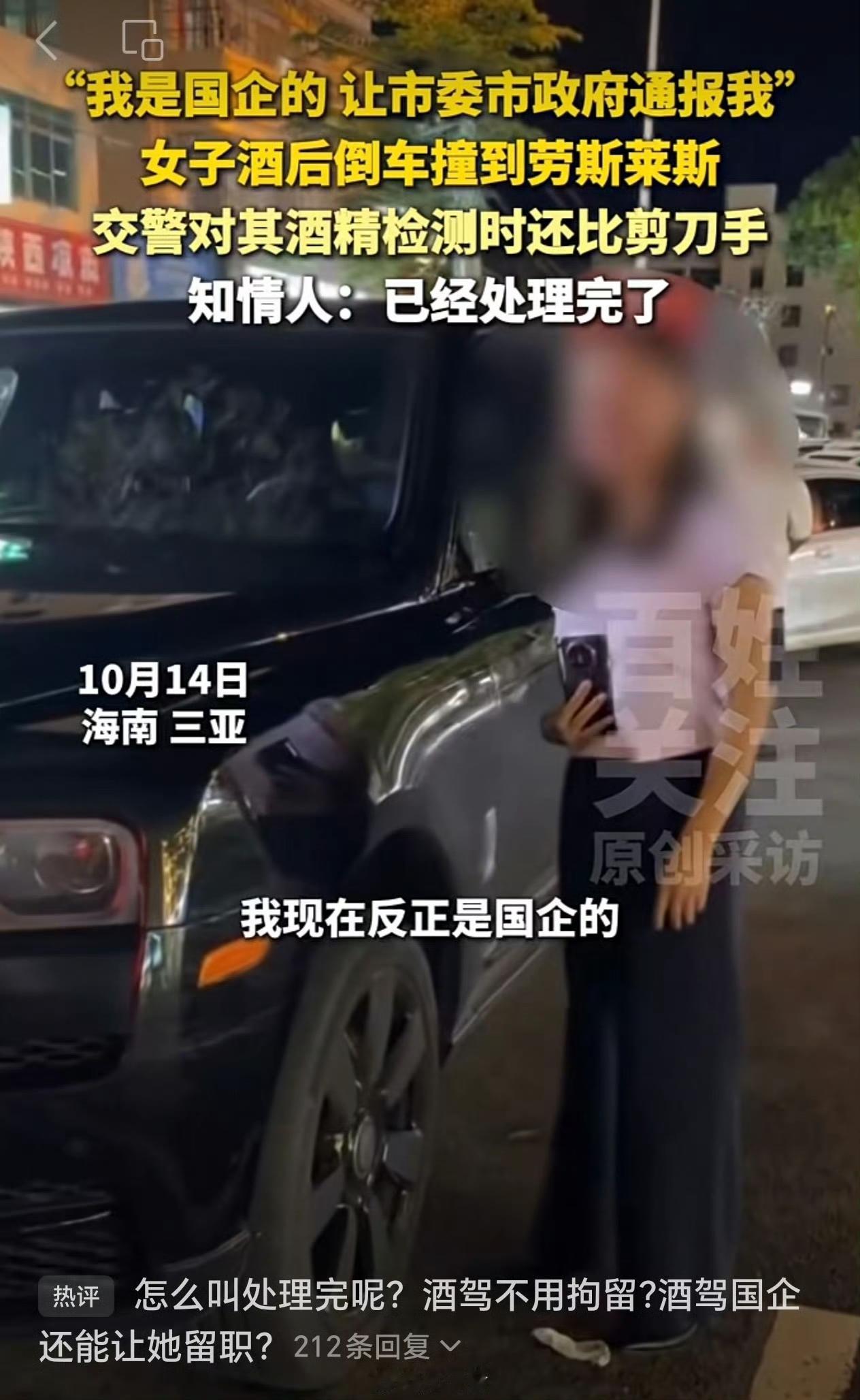 猜测酒驾女子如果真是国企员工,被警方拘留后,很可能会丢掉工作,这都上热搜了,谁也不会去包庇她了。撞了劳斯莱斯后,面临着大额赔偿,心态一下子就崩了,面对镜头语无伦次,女司机在面对突发事件时,太容易感情用事。三亚撞劳斯莱斯女子涉嫌危险驾驶罪 醉驾撞人致死 醉驾致死 酒驾 醉驾赔偿 司机醉驾 醉驾私家车 醉驾免责处罚