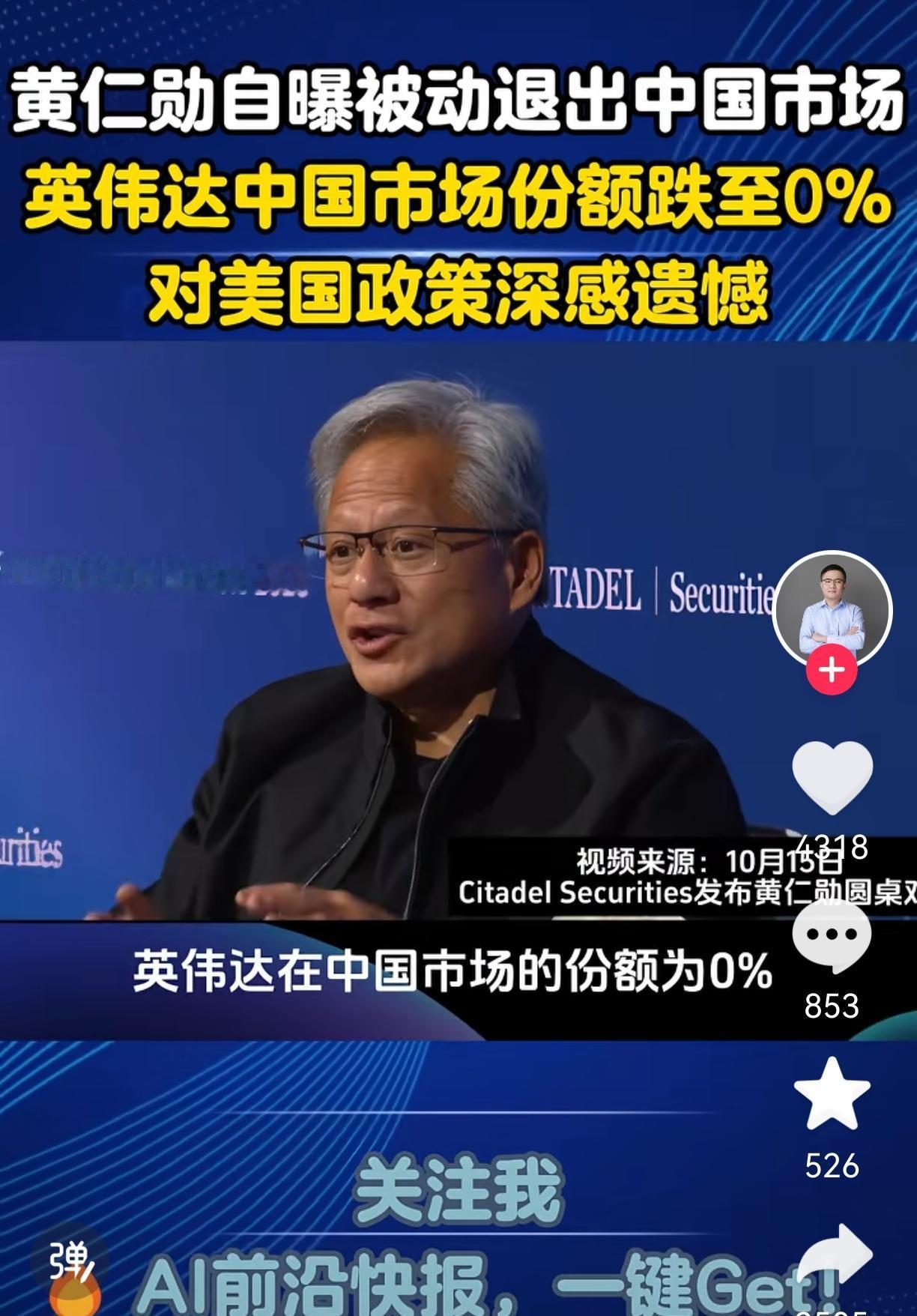 一觉睡醒,英伟达哭晕在厕所 黄仁勋最近急得不行 ,之前英伟达在中国高端芯片市场占了95%份额 ,现在直接跌到0% ,美国搞出口管制 ,把自家公司逼得彻底退出中国市场 ,他说这是个错误 ,可现在说这些有啥用, 市场都没了。 他还说伤害中国的事往往更伤美国 ,中国工程师的拼劲他见过 ,不是随便能比的 ,美国以为卡脖子就能拦住 ,结果倒好 ,自己丢了最大市场之一 ,英伟达现在就想回去 ,可市场哪能说回来就回来。 现在知道错了?中国市场哪是说退就能退 说进就能进的?