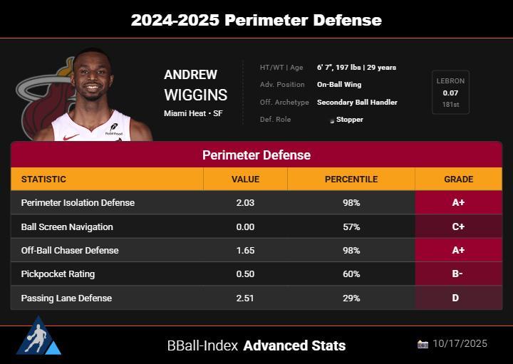 数据来源于BBall-Index高级统计,发布时间为2025年10月17日,维金斯在外线单防和无球追防上极具优势,但在传球路线防守上存在明显短板。