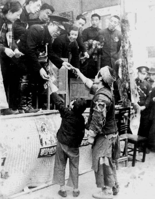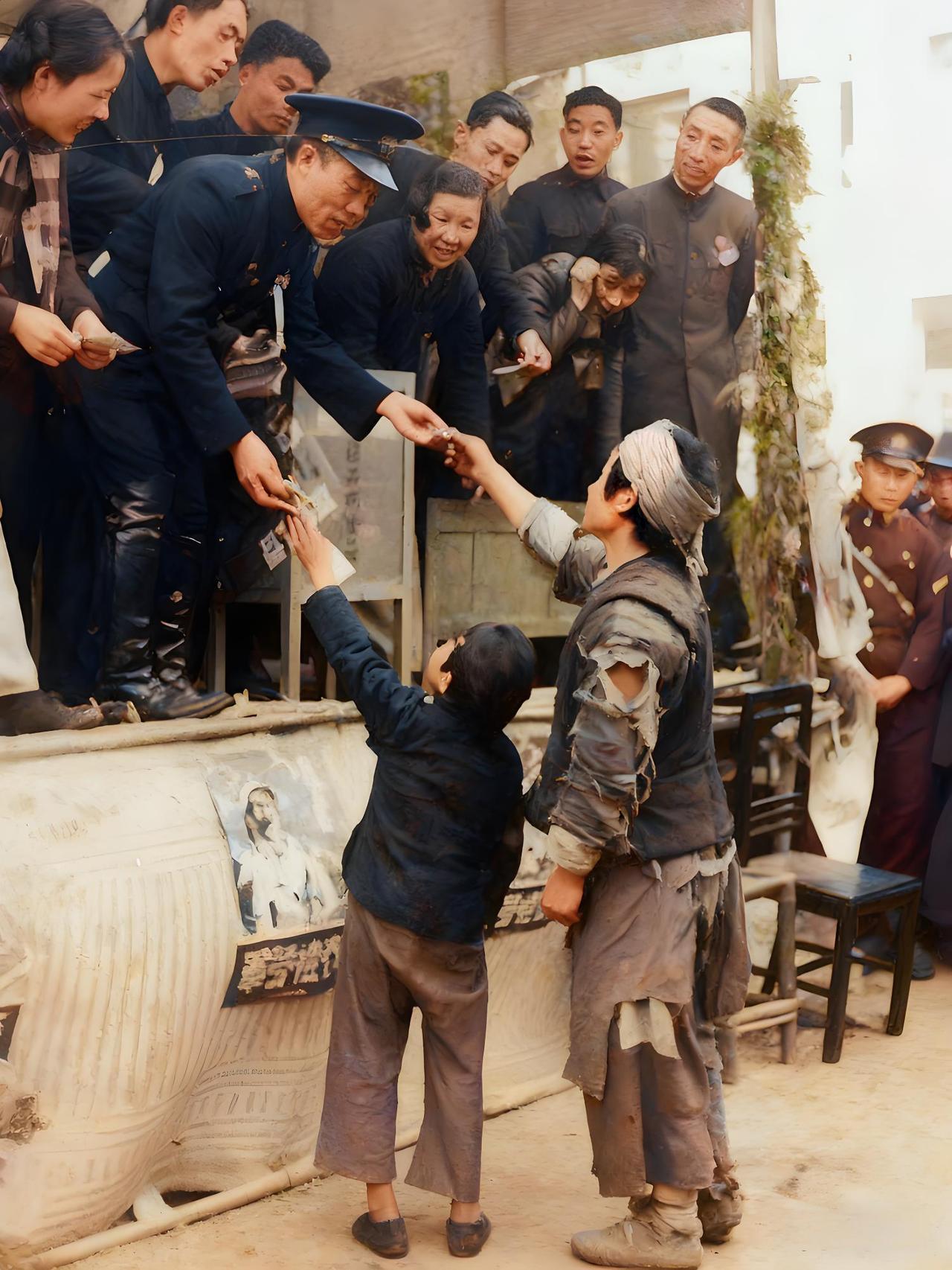 这张照片中,一名衣衫褴褛、满身补丁的乞丐,头戴旧头巾,正将捐款郑重地递向台上的警察;身旁还有个孩子也伸出小手参与捐赠。台上,身着黑色警服的警察俯身接收,周围围观的民众或面露赞许、或神情凝重。 在抗日战争的烽火中,即便身处社会最底层、挣扎于温饱边缘,这名乞丐仍以微薄之力践行着“国家兴亡,匹夫有责”的信念。彰显了中华民族在危亡之际,不分阶层、万众一心的抗战决心——哪怕是最平凡的个体,也愿以自己的方式,为民族的存续拼尽全力。这种朴素却炽热的爱国情怀,是全民抗战最终胜利的精神基石之一。