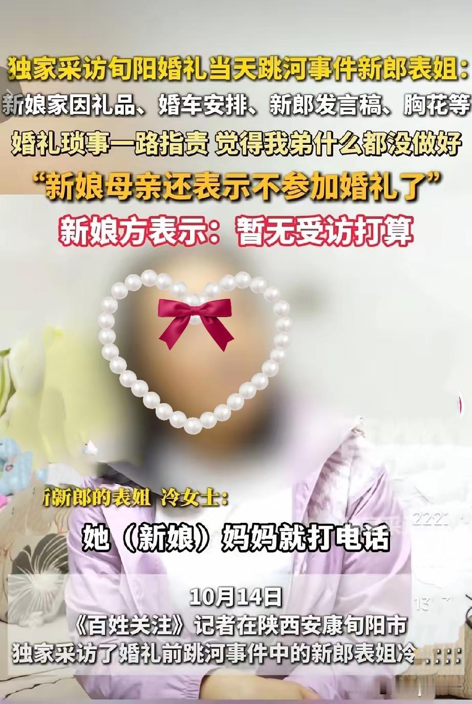 旬阳跳河新郎更多细节被爆出,新郎的表姐哭着说,当时新郎跑出去的时候,自己想抓没抓住。当时新娘坐在车里没动静。 表姐在结婚当天就坐在车里的后座上。她说接到新娘往婚礼现场走的时候,新娘母亲一遍遍给新娘打电话,第一次嫌八样礼他们带了四样。之后又打电话嫌接她的车没到,她不去参加婚礼了,别想在婚礼上看到她。 新娘在车上不断抱怨新郎,嫌新郎家礼品、婚车、发言稿,甚至胸花等小事都安排的不好,新郎这时候很少说话,一直听着新娘的数落。后来新郎哭了,他表姐还劝他,大喜的日子,想开一点。表姐没想到在经过大桥的时候,新郎突然让停车,然后把手机拿出来放在车顶,他哭着说对不起他爸妈,然后就往大桥上跑。表姐想抓住他,可惜没抓住,就想找个摩托车去追他,可是一转眼新郎就不见了。 表姐想起来一直在自责,说着说着也哭了。可是婚车里的新娘,和新郎认识了十几年的爱人,反而无动于衷。这哪是结婚啊,分明是一场压垮人的“审判”——一边是岳母步步紧逼的挑剔,一边是相处十几年的爱人全程冷漠旁观,新郎心里的那根弦,早被这些细碎的恶意磨断了。 真不是新郎脆弱,而是这场婚姻从一开始就没藏着半点体谅。连表姐都能看出他的崩溃,新娘却像个局外人,这样的两个人硬凑在一起,结婚不过是把矛盾摆上台面的导火索。你们说,要是新娘当时能少说一句抱怨,或者伸手拉一把,这事会不会有不一样的结局?