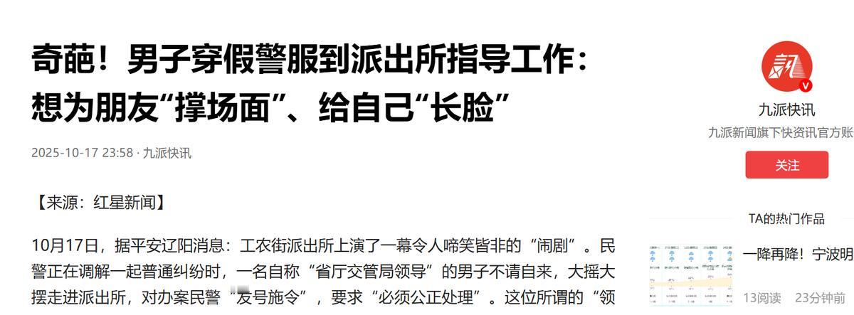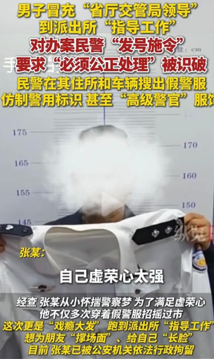 辽宁辽阳,一派出所民警正在调解纠纷,没想到,这时一名穿着白色警服的男子不请自来,不仅自称是领导,还对案件指手画脚,可很快就露馅了,男子竟然是假冒领导,来给朋友“撑场面”的。 前阵子辽宁辽阳派出所出了个挺荒唐的事儿,当时所里的民警正忙着调解一起民间纠纷,双方当事人还在为琐事争得面红耳赤呢,谁都没料到,办公室门口突然传来一阵脚步声,紧接着就闯进来个穿白色警服的男人。 这人一进门就自带一股 “领导范儿”,肩膀上还别着看着挺唬人的肩章,手里攥着个文件夹,径直走到调解桌旁,扫了眼在场的人,就开始对着案子指手画脚。 他一会儿说民警 “调解思路不对”,一会儿又对着当事人说 “这事得按规定来,不能私了”,那语气拿捏得挺像那么回事儿,一开始不仅当事人懵了,连旁边帮忙记录的辅警都愣了下,以为是上级单位来检查工作的领导。 可没说几句话,经验丰富的老民警就觉得不对劲了,按理说真要是上级部门来的人,开口会先亮明身份、说明来意,哪会一上来就直接插手具体案子,而且问他具体属于哪个部门、平时负责哪些工作,他要么含糊其辞,要么绕着圈子说 “都是为了公正处理”,翻来覆去就这么一句。 民警心里起了疑,就找了个借口把他请到旁边办公室,进一步核实身份,这一问破绽就全露出来了,他说不出系统内的工作流程,连基本的执法规范都答不上来,眼神还一个劲地躲闪。 最后民警依法对他进行检查,从他包里搜出了不少 “宝贝”,除了身上穿的假警服,还有仿制的警徽、甚至印着高阶警官头衔的胸牌,凑在一起简直像个小型的 “私人警服装备库”。 直到这时候男人才垮了架子,低着头说了实话,他姓张就是本地普通人,之所以穿假警服来派出所,是因为正在调解纠纷的当事人里有他朋友。 朋友觉得自己在纠纷里没底气怕吃亏,就跟他抱怨了几句,张某一直有个没实现的 “警察梦”,平时就喜欢收集些跟警察相关的东西,还总想着在朋友面前 “撑场面”,一听这话就脑子一热,翻出自己私藏的假警服穿上,琢磨着来派出所装成领导镇镇场子,帮朋友 “长点脸”,没想到刚演了没一会儿就被识破了。 要是说辽阳这事儿是场没恶意的荒唐闹剧,那几年前山东临沂周长胜那伙人干的,就是实打实的犯罪大戏了,性质完全不一样。 他们可不是单枪匹马,五个人凑成一个团伙,分工明确,道具也比张某高级多了,开着豪车身上挂着大校、上校的假军衔,张口就说自己是 “中央特使”,手里还攥着所谓的 “一号首长紧急指令”,目标特别明确,闯进当地公安局,把他们团伙里因为诈骗被关押的同伙给救出来,简直就是现实版的 “劫狱”。 这伙人也不是第一次干坏事了,之前就虚构了一个叫 “中华人民共和国特殊监督机制” 的假组织,长期冒充军人到处诈骗,光是骗来的钱就超过 850 万元,这次硬闯公安局不过是他们犯罪生涯里一次更疯狂的冒险,为的就是保住整个诈骗链条的核心利益,跟张某那种只想给朋友撑场面的小打小闹比,危险程度和恶劣性差了十万八千里。 当然不管是个人闹剧还是团伙犯罪,最后都逃不过法律的制裁,张某虽然没造成实际的诈骗后果,行为也只是荒唐,但冒充军警人员本身就违法,最后被处以行政拘留,而周长胜团伙因为有组织地招摇撞骗,还犯了更严重的罪,主犯直接被判了七年有期徒刑。 法律的尺子拎得很清,冒充军警人员这种事,本身就比普通违法犯罪性质更重,毕竟制服背后连着的是国家公信力。 不管是张某那种想靠假身份换尊重的,还是周长胜团伙想用假制服当犯罪工具的,本质上都是在消耗大家对执法部门的信任。 本来大家看到穿制服的人,心里会觉得踏实,可要是总出现这种冒牌货,不仅普通人容易上当,真警察办案时也会多不少麻烦。 而且仔细想想,张某要是真有 “英雄梦”,完全可以去当志愿者、做公益,用实在的行动帮人,周长胜那伙人要是把心思用在正路上,也不至于落个蹲大牢的下场。 (信息来源:九派快讯——奇葩!男子穿假警服到派出所指导工作:想为朋友“撑场面”、给自己“长脸”)