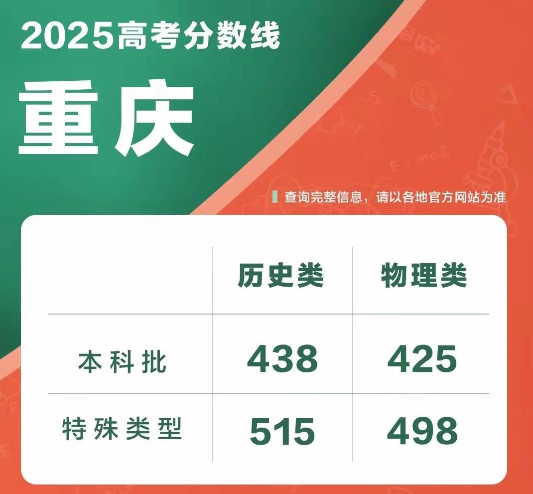 2025重庆高考分数线出炉!分数背后是无数家庭的期待与选择 2025年重庆高考分数线公布了,历史类本科批438分,物理类本科批425分;特殊类型招生控制线历史类515分,物理类498分。这组数字的背后,是无数重庆考生和家庭的期待、努力与选择。 对于分数超过特殊类型招生控制线的考生来说,他们有机会冲击更好的院校和专业,在学术深造、职业发展上拥有更广阔的空间。而达到本科批分数线的考生,也将开启自己的大学之旅,在不同的高校里探索知识、塑造自我。 高考分数线是一道门槛,它划分了不同的升学路径,但绝不是人生的分水岭。考得好的同学,要珍惜机会,在大学里继续拼搏;分数不太理想的同学,也不必气馁,本科院校里同样有很多优质的专业和资源,专科院校的技能培养也能让你在就业市场上找到自己的位置。 重庆的高等教育资源也很丰富,有重庆大学这样的985高校,西南大学这样的211高校,还有重庆邮电大学、重庆医科大学等特色院校。不同分数段的考生都能找到适合自己的学校和专业,关键是要结合自己的兴趣和职业规划来选择。 高考只是人生的一个阶段,它的意义在于让你经历一次全力以赴的拼搏,在于让你学会面对结果、规划未来。无论分数如何,只要你保持进取的心态,不断学习和成长,都能在自己的人生道路上走出精彩。 那么,你觉得高考分数线对考生的未来发展,到底有多大的影响呢?2025分数线 重庆升学 重庆高考题 重庆升学规划 重庆高中保送 重庆高考时间 重庆高考预估线