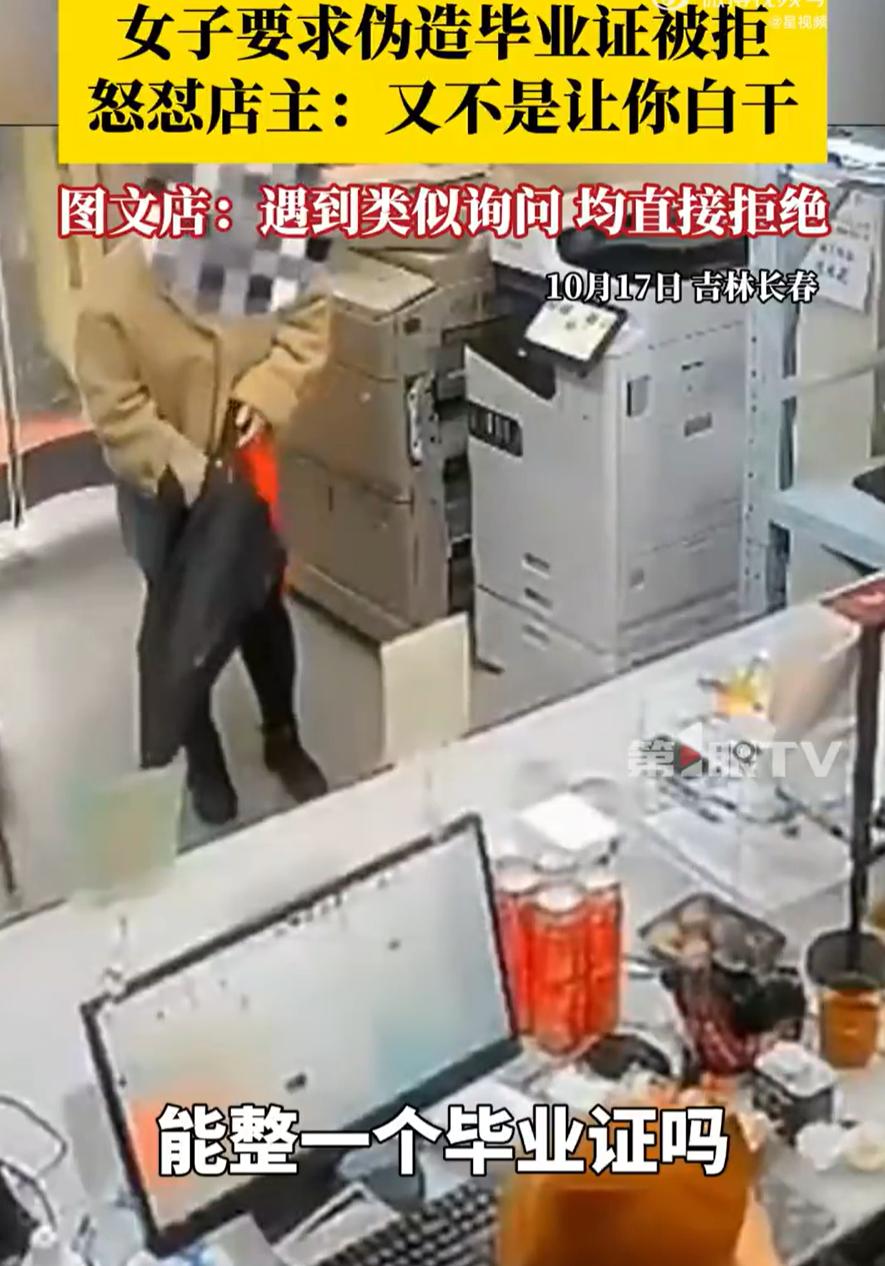 吉林长春,一女子走进一家图文店,张口就询问店主:能不能整一个毕业证?店主反问后得知女子要求伪造毕业证,于是当场拒绝,可女子临走时却不以为然,反怼道:又不是让你白干! 起初,女子进店询问后,店主怕自己理解有误,反问道:整一个毕业证是啥意思?做一个? 女子肯定回答道:对,做一个 店主摇头:这个做不了 女子:为啥做不了啊,没有模版啥的? 店主觉得又好气又好笑:我为什么要有模板?国家还能天天批量生产假证不成? 女子顿时拉下脸来,走到店门口又回头扔下一句:我只是问你,给你钱,又不是让你白干,你不是要挣钱的吗? 事后,图文店老板表示,店里明确都有告示,告知这种事是违法的,当时一说办不了,女子就开始生气了 说起来,女子这种理直气壮的态度确实让人无语,她似乎真不觉得这是在违法,反而认为店主不肯帮忙是在故意刁难 其实图文店主何尝不想做生意?但他清楚底线在哪里。伪造证件不是普通的违规,而是刑事犯罪。根据刑法,伪造事业单位印章的,处三年以下有期徒刑。而毕业证正是加盖了高校印章的法律文书 与其想着如何伪造证书,不如踏踏实实学门手艺。现在线上学习平台这么多,免费课程随处可见。哪怕是报名参加职业培训,考取正规证书,也比弄虚作假来得踏实。真正的能力不是一纸文凭能够代表的,而没有真才实学,再漂亮的证书也只是一张废纸