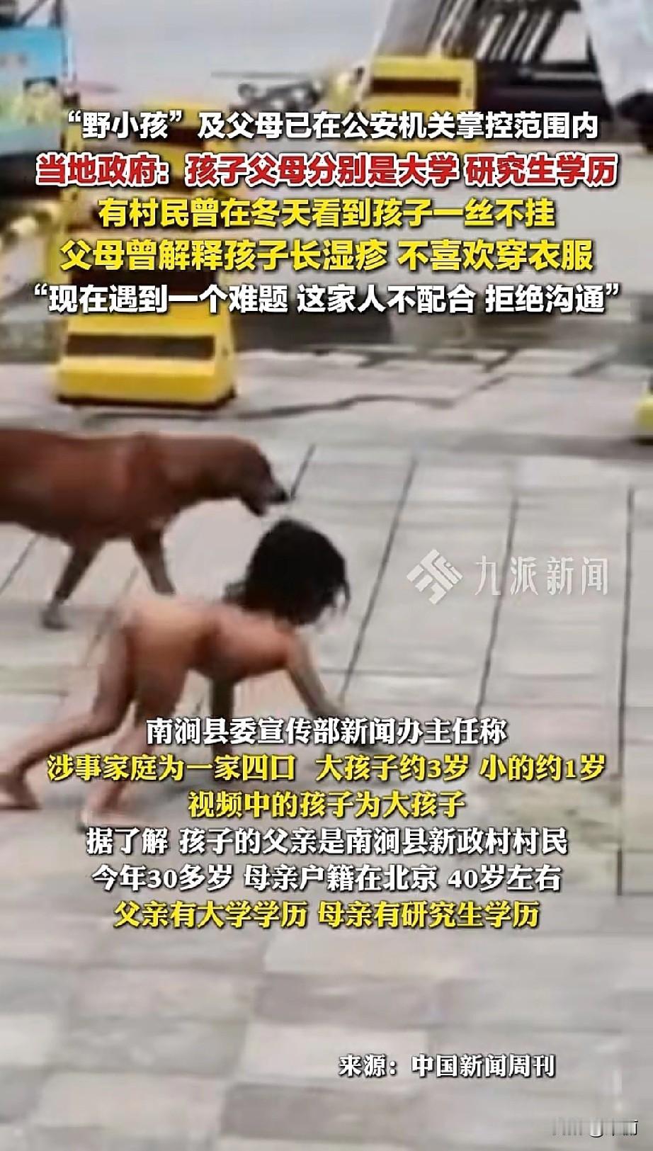 四川石棉服务区,网友拍到全身赤裸的孩子,爬行、进食举止异常,被称“野人孩子”。 孩子来自云南南涧县,父母都是高学历,父亲大学毕业,母亲是研究生。他们说孩子长湿疹怕摩擦,还称不穿衣服是生活方式,外人无权干涉。 村里人、当地派出所和民政局劝过多次,都没效果。 现在警方和工作组已找到人,孩子和父母在管控范围内,孩子安全,正查父母是否违法。 这根本不是自由。《未成年人保护法》规定父母得履行监护职责,公共场合让孩子赤裸,既违公德也可能侵犯隐私。 高学历不代表会当父母,养育孩子不能只凭自己想法,孩子的健康和权益才该放第一位。
