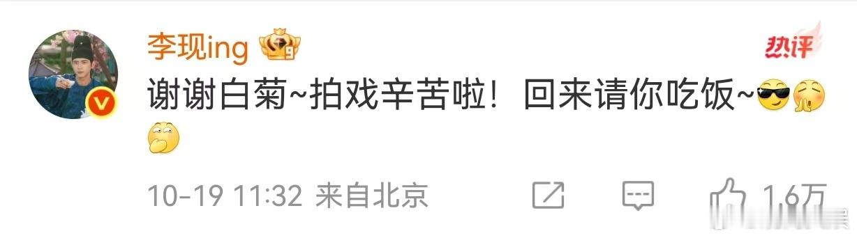 李现回复:“谢谢白菊~拍戏辛苦啦!回来请你吃饭~[酷][鼓掌][偷笑]”