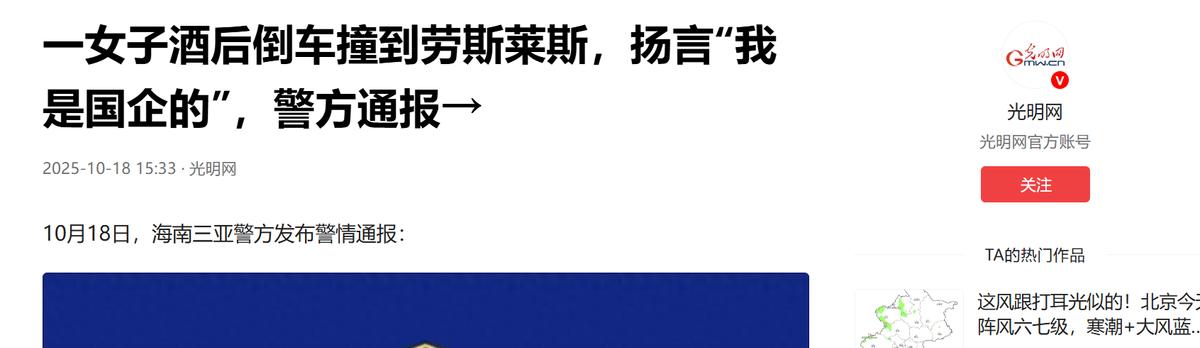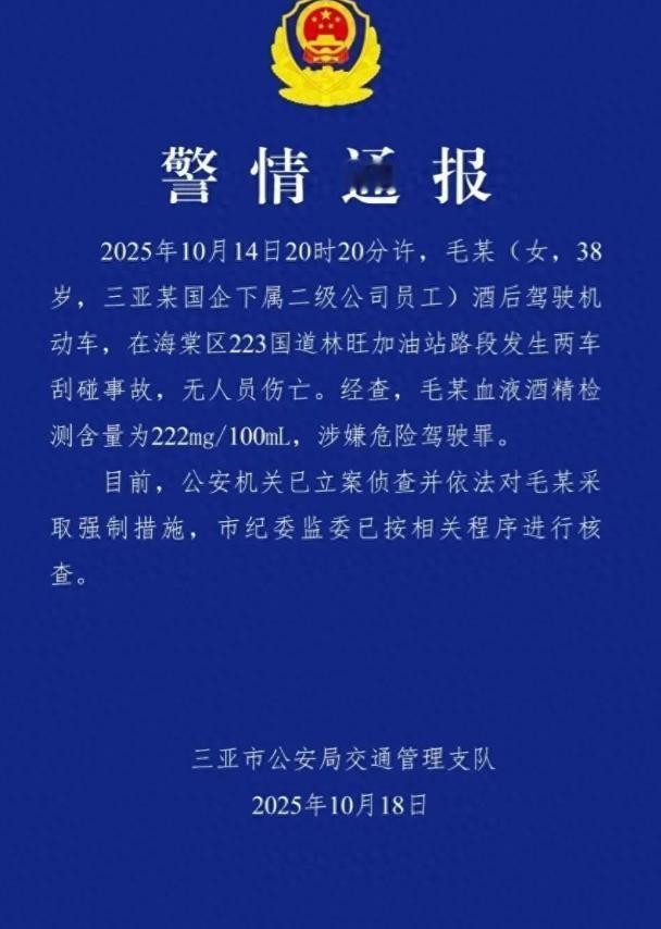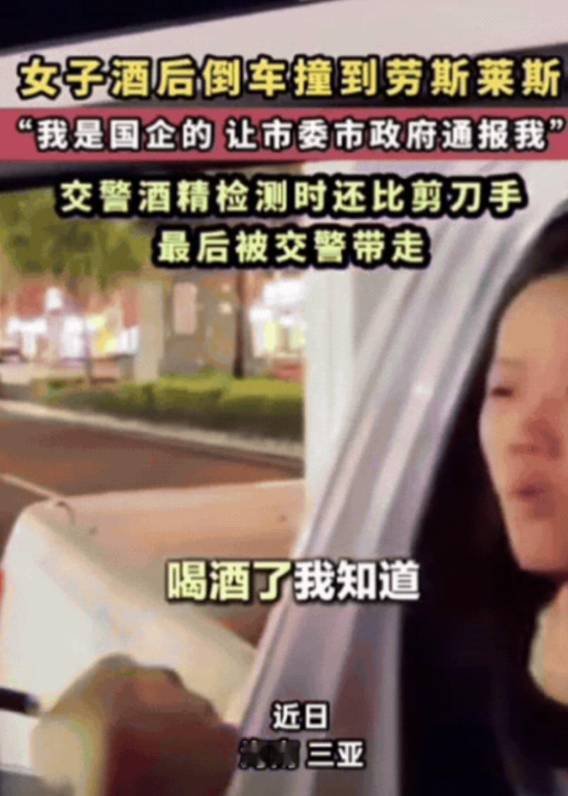 无知真可怕!三亚一女子酒后倒车,不慎撞上劳斯莱斯,可她不仅没有害怕,反而在现场叫嚣:“我是国企的,让市委市政府通报我”,就算是交警来了,她也依然不怂,甚至在交警酒精检测时,女子还对着镜头比剪刀手!网友:这女的未喝酒时它是三亚的,喝酒了三亚是它的。 那会儿街上已经没多少车了,38 岁的毛某喝完酒,自己开着车准备走,倒车的时候没留神,“咚” 一下就撞上了旁边的一辆劳斯莱斯。 换作普通人别说撞的是这种豪车,就算是辆普通家用车,又赶上自己喝了酒,早就慌了神,赶紧下来跟人道歉、商量怎么处理,生怕事儿闹大。 可毛某倒好不仅一点没害怕,反而站在那儿跟被撞的车主叫板,嘴里还嚷嚷着 “我是国企的,让市委市政府通报我”,那语气里的嚣张劲儿,不知道的还以为她多大来头。 被撞的车主姓李,其实一开始还想私了,毕竟都是开车的,谁没个不小心的时候,可一听毛某这话,再看她那满不在乎的样子,李某也没了私了的心思,直接就报了警。 等交警赶到现场,毛某的酒劲好像还没过去,一点没收敛,对着交警也照样不怂,该嚷嚷还是嚷嚷,丝毫没觉得自己酒后开车、还撞了车有啥不对。 后来交警按流程要给她做酒精检测,拿检测仪递到她面前的时候,她居然还对着旁边的镜头嬉皮笑脸地比了个剪刀手,那模样哪儿像是在接受执法检查,倒像是在景区打卡拍照。 周围看热闹的人都看傻了,有人偷偷录了视频,发到网上没一会儿就火了,网上看这事儿的人都乐了,有人调侃说 “这女的没喝酒时,她是三亚的,喝了酒三亚是她的”,这话听着逗,其实特戳中事儿的本质她怕不是喝糊涂了,真把自己那 “国企员工” 的身份当成能横着走的特权了。 可现实哪儿能惯着她这毛病。酒精检测结果一出来,数值高得吓人,222mg/100mL,这都快赶上醉驾标准的三倍了,直接就够上刑事案件了,不是简单罚款扣分就能完事的,接下来等着她的是 “危险驾驶罪” 的刑事指控。 更别说被撞的劳斯莱斯,后来定损出来要 12.8 万元,这么大一笔钱,因为她是醉驾,属于严重违法,保险公司直接说了不赔,这笔钱全得她自己掏腰包。 她之前嚷嚷着的 “国企身份”,不仅没帮上她半点忙,反而成了 “催命符”,这事儿一传开,她所在的那家文旅国企连夜就出了通知,把她的职务给暂停了,还组织全公司的人都签了《拒绝酒驾承诺书》,明摆着是要跟她划清界限,生怕她这事儿影响了单位的声誉,她当时以为能当 “护身符” 的身份,最后倒成了砸自己饭碗的石头。 现在再回头看这事儿,真不是酒精单纯闹的,更多是她心里那点糊涂的优越感在作祟,她可能觉得自己在国企上班,就比别人特殊能凌驾于规则之上,可她忘了不管你是啥身份,只要碰了法律的红线,该承担的后果一点都少不了,酒后开车本就是拿自己和别人的安全当儿戏,撞了车还敢叫嚣特权,这不是无知是什么? 最后她不仅要面临法律的制裁,掏一大笔维修费,工作也悬了好好的日子全被自己这顿酒、这通嚣张给毁了。 (信息来源:光明网——一女子酒后倒车撞到劳斯莱斯,扬言“我是国企的”,警方通报→)