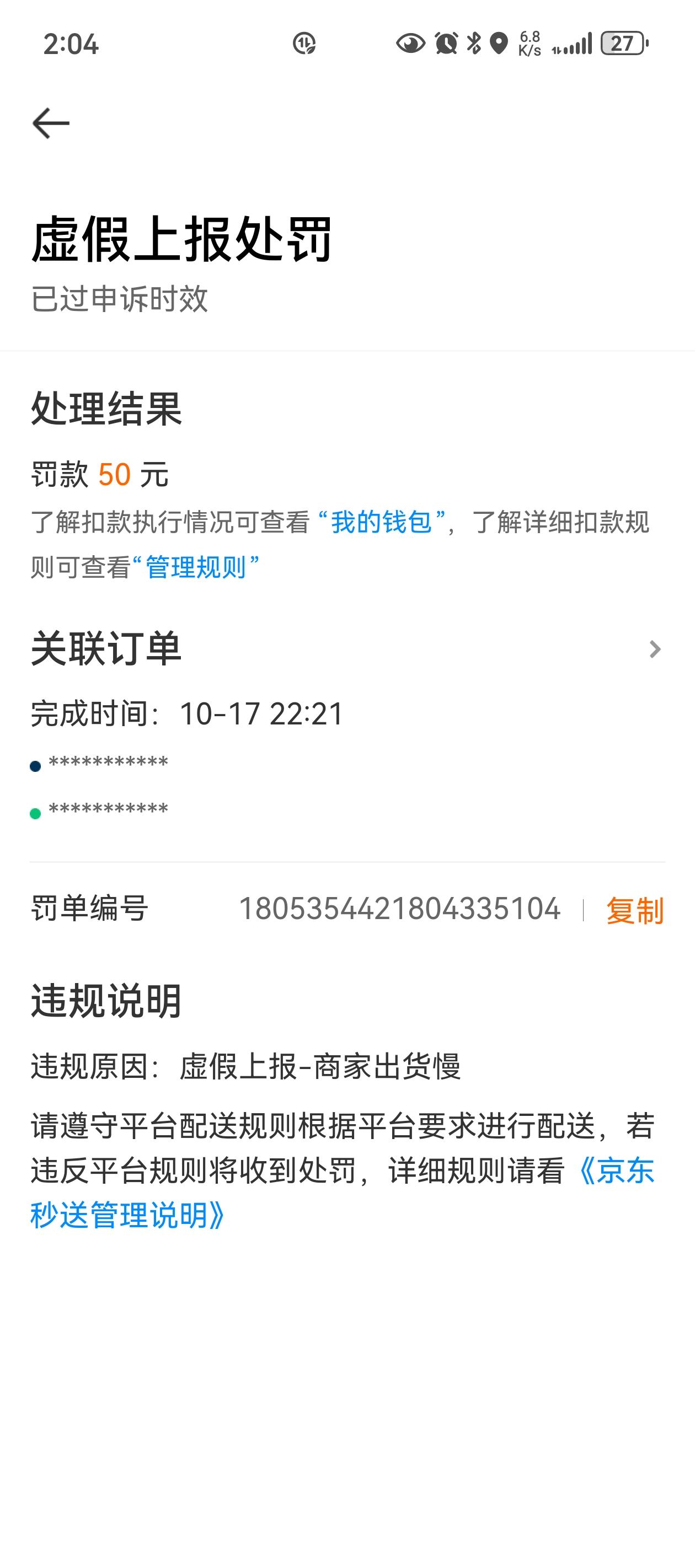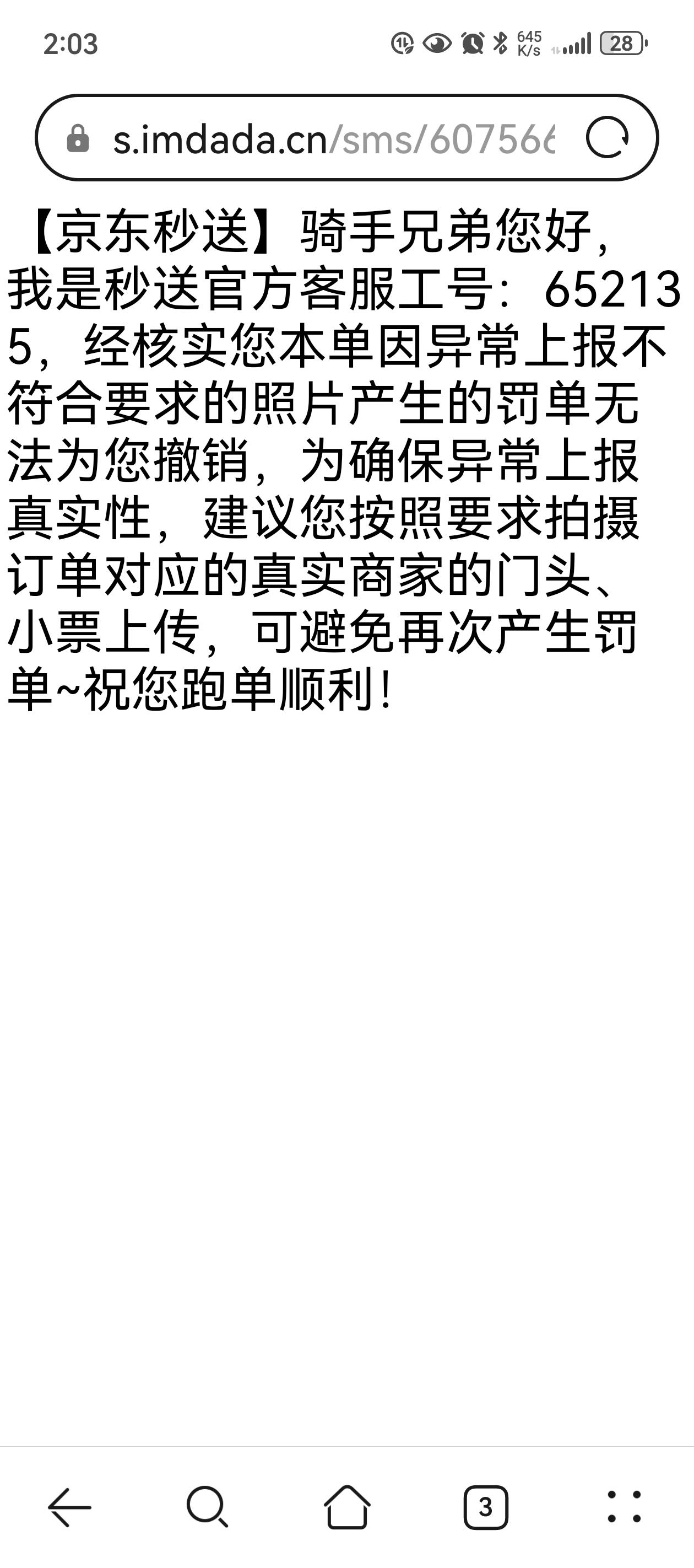 京东外卖一跑一个不吱声,分币不赚,还倒贴50这你受的了吗!? 根据骑手群爆料,10.17号晚上10点14分,一兄弟抢了个披萨的单,到店才发现店家还没做,而披萨烤制需要5-7分钟,便去附近拿别的餐。 五分钟后,披萨还没出餐,这兄弟便在商家100米内,拍了商家店后面的图片上报商家出餐慢,系统显示审核通过,让这兄弟选择取消订单或者继续配送。 这兄弟选择取消订单,继续送别的餐去了。 当时没任何问题,到了第二天中午11点,这兄弟收到罚单,说虚假上报出餐慢罚款50,且不可申诉。 也就是说,这一单这兄弟分币没赚,还倒贴50。 罚款的理由是这兄弟没有拍商家的门牌或者店内图片,上传的图片不对。 这兄弟当时就向京东客服申诉,核心观点就是【按照京东外卖的流程,上报商家出餐慢有审核验证流程,图片若是不合规,为何又能审核通过,审核通过后又因为图片不合规来罚骑手的钱,这岂不是自己打自己的脸?说通过的是你,说不通过的也是你?】 24小时后,京东客服下发短信,说这兄弟的罚款无法撤销。 看到短信,这兄弟真的气笑。 明显不合逻辑的流程居然还站住了?那审核验证这一步有必要性吗? 最后,想跑外卖的兄弟们注意些,别钱没赚到倒贴钱! 不光小东,小美,小鸟都是一样的。