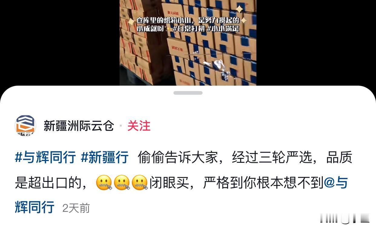 刷到新疆洲际云仓打包发货忙的热火朝天 评论区有个新疆的问为啥不给他发货 云仓的人回答说自己“去楼下买去”[笑哭] 这是打包打急眼了嘛 意思是新疆本地的别添乱 先紧着其他省份的朋友[耶] 好的好的,为你点赞[比心] 这位博主还说与辉同行选品特别严格 经过三轮筛选,品质超过出口水准 本来就挺放心的,既然你这么说了 那就更放心啦[耶]