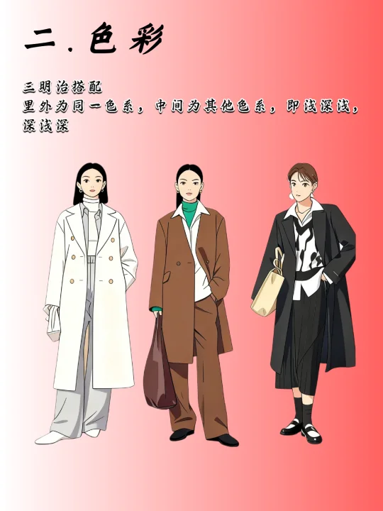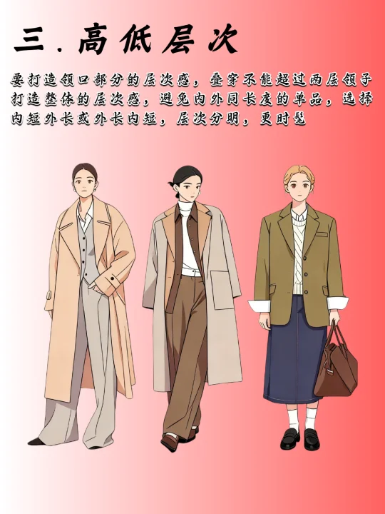 - **整体层次**:避免内外单品长度完全一致,选“内短外长”或“外长内短”的组合,层次分明更时髦(比如短衬衫+长大衣、长内搭+短外套)~