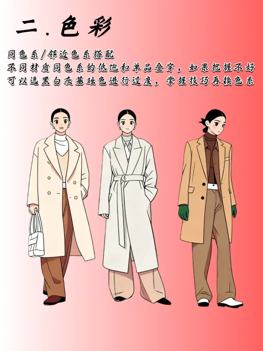 同色系/邻近色叠穿 不同材质的**低饱和同色系单品**叠穿(比如羊绒大衣+针织衫+丝质内搭,都选大地色系),高级感直接拉满!新手怕出错的话,先用黑白灰基础色练手,掌握技巧后再尝试其他色系~