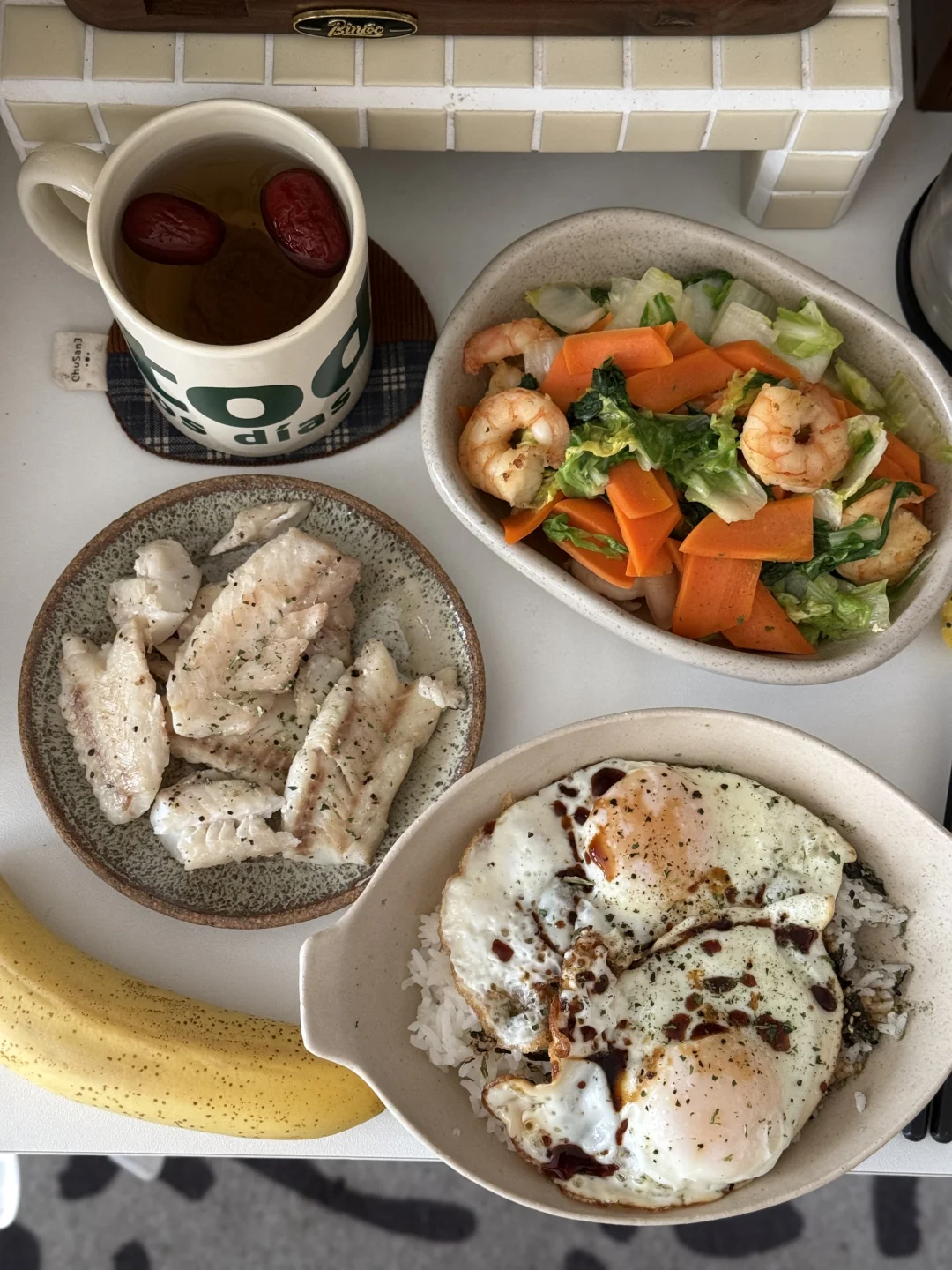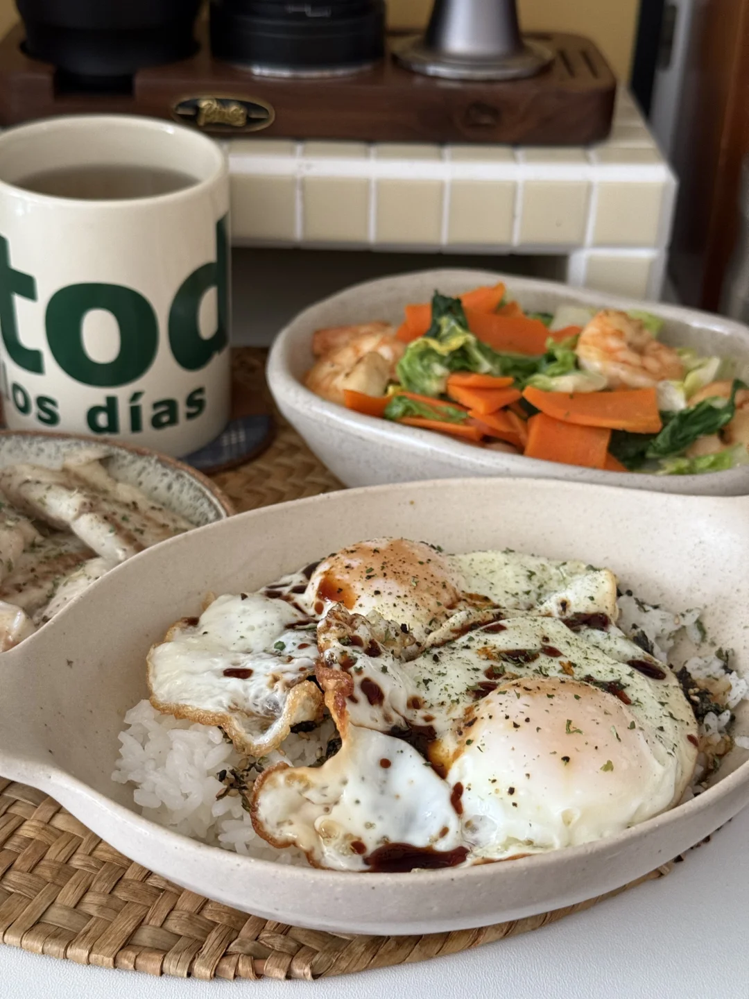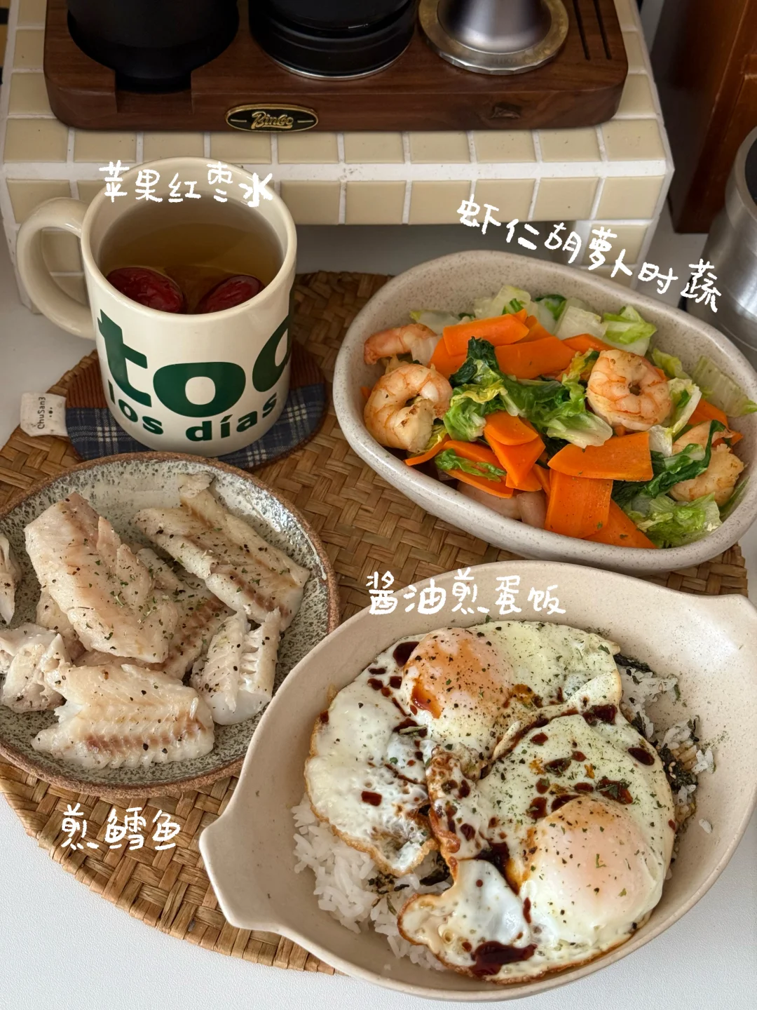 谁说一人食就要随便对付? 今天的午餐必须仪式感拉满! - ✨酱油溏心蛋盖饭 🍤虾仁胡萝卜时蔬小炒 🐟香煎鳕鱼 🥤苹果红枣水 -