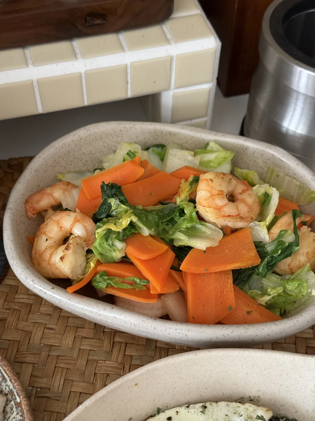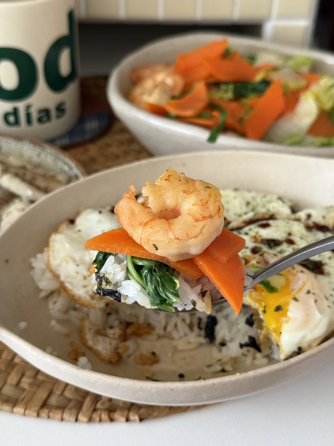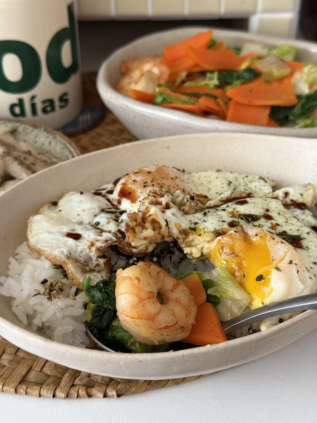 谁说一人食就要随便对付? 今天的午餐必须仪式感拉满! - ✨酱油溏心蛋盖饭 🍤虾仁胡萝卜时蔬小炒 🐟香煎鳕鱼 🥤苹果红枣水 -