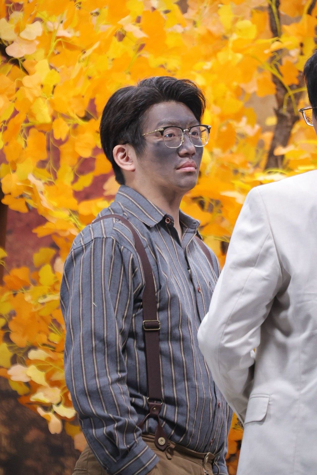 刘同黑脸上台喜人奇妙夜 没认出来系列!刘同满脸黑灰上台,从幕布后钻出来时,黝黑脸蛋格外显眼,日常穿搭配搞怪妆容,刚出场就贡献笑点。